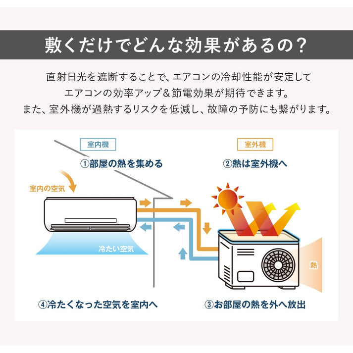 遮熱材が配合されたシートは敷くだけで遮熱効果も抜群。使用した際の温度差は約24℃差と驚きの結果に!室外機の温度上昇を抑え、エアコン効率を各段にアップさせます。