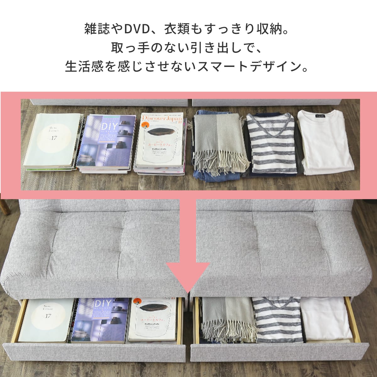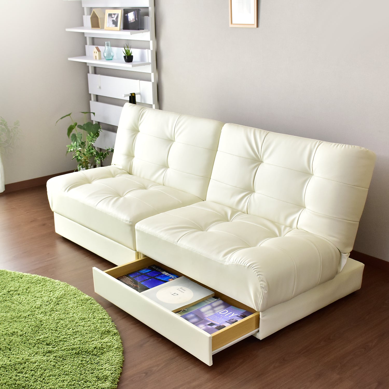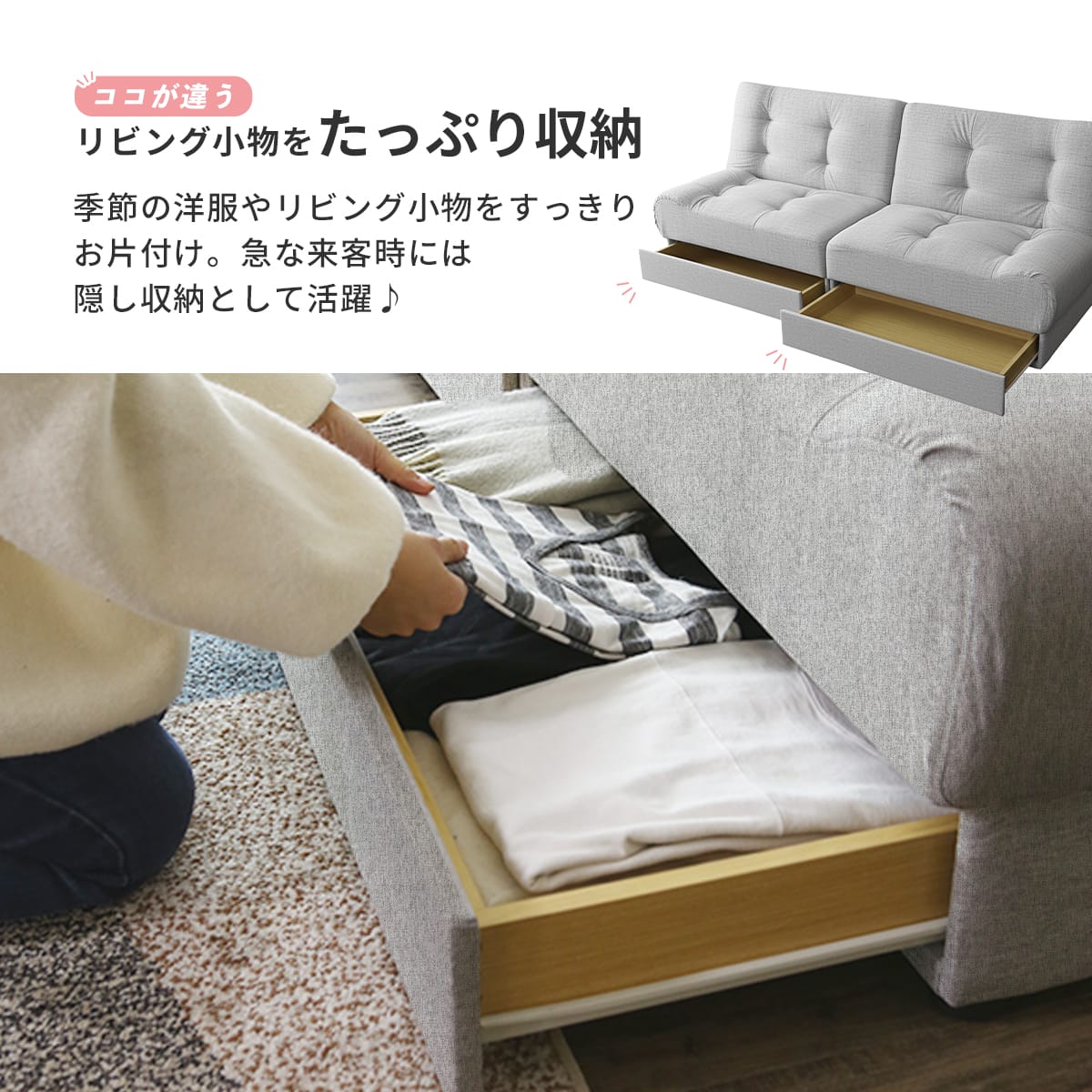 | 耐荷重 | 【ソファ】各:90kg 全体使用時:180kg 【ベッド】全体使用時:120kg 【引き出し】各:7kg |