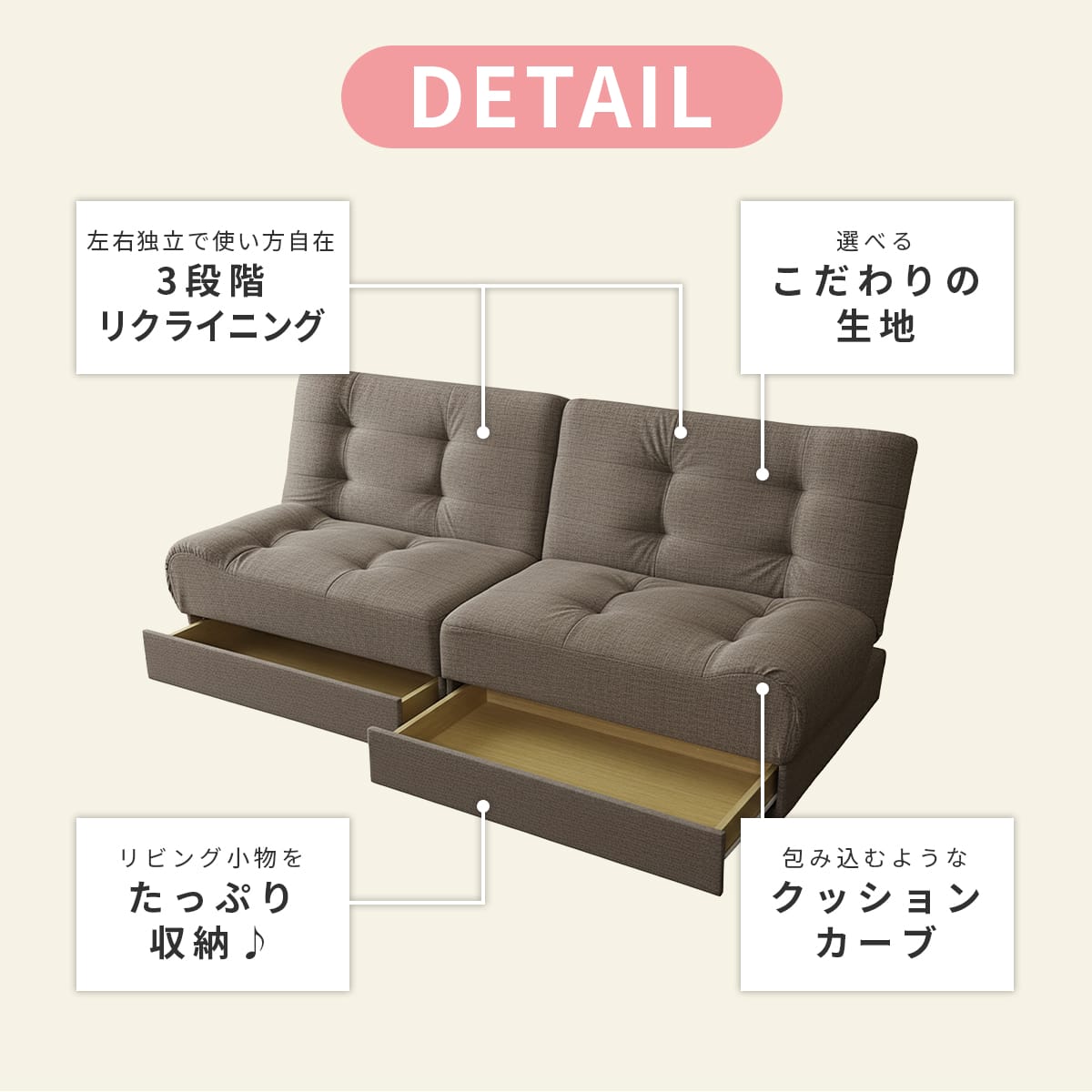 | 材 質 | 貼り材:ファブリック/合成皮革 構造部材:天然木、合板、綿、不織布、ウェイビングベルト、 Sバネ(連結式鋼製組バネ)、ポリプロピレン クッション材:ウレタンフォーム |
