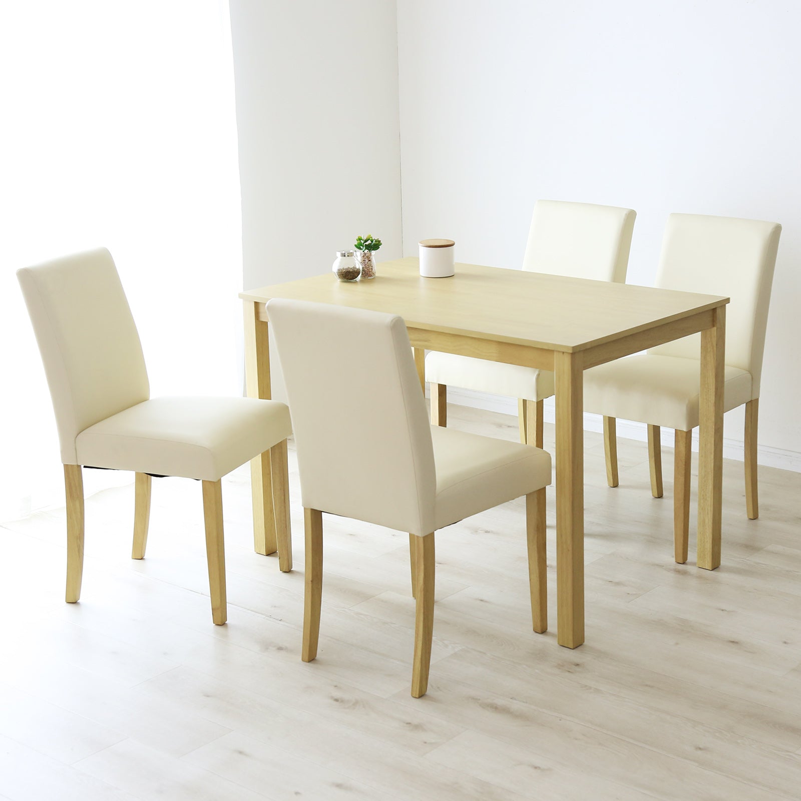 材質 | ラッカー塗装 天板:MDF・ラバーウッド突板 脚:天然木 チェア:ウレタンフォーム・合成皮革 |