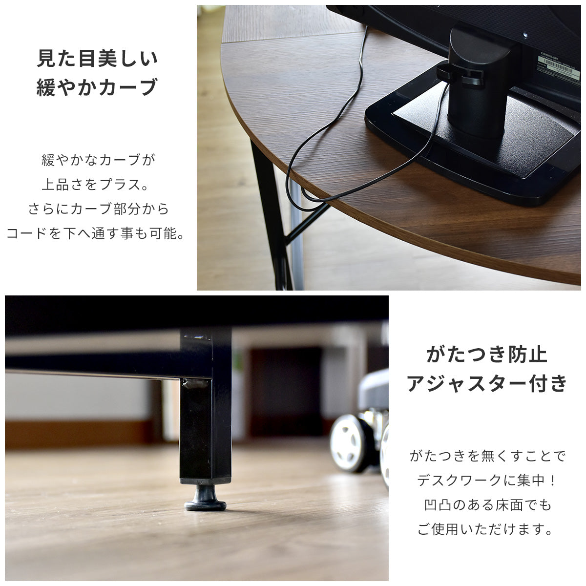 - 【こだわり設計のデスク】 優しいカーブが上品さをプラス。 支柱同士を支え補強を追加。 ガタツキをおさえるアジャスター付き。 天板はキズや汚れに強いメラミン加工です。