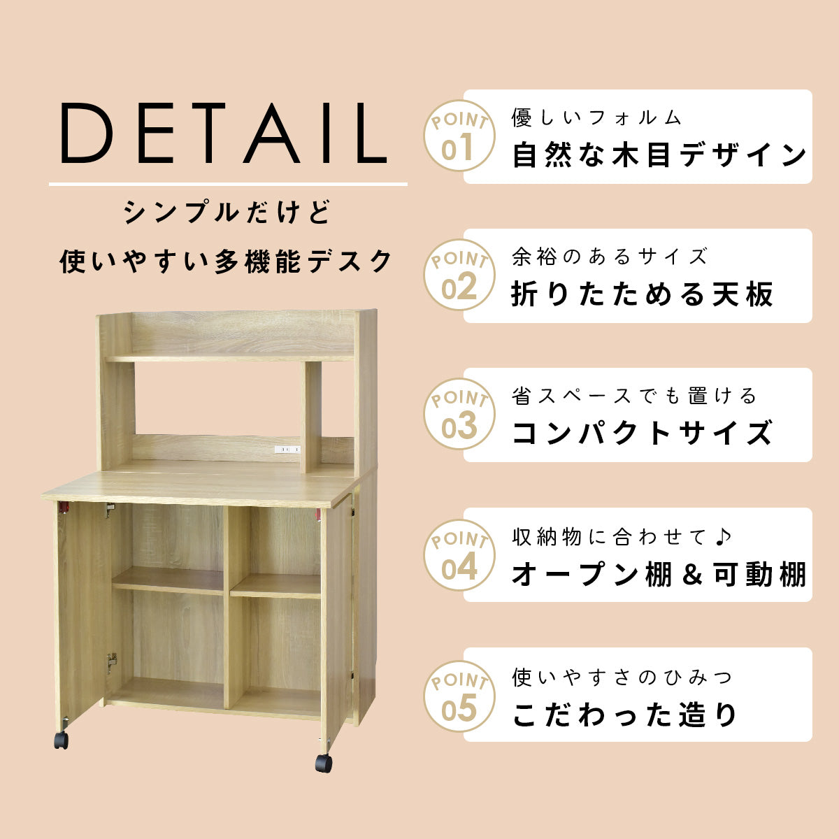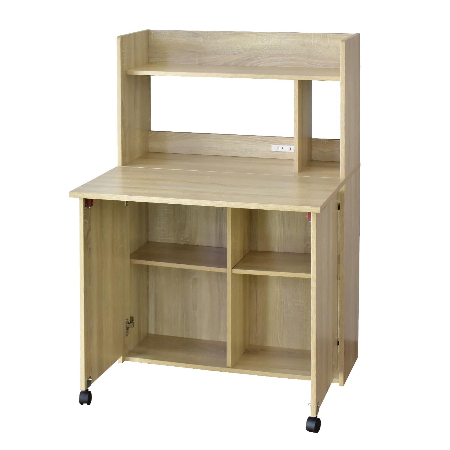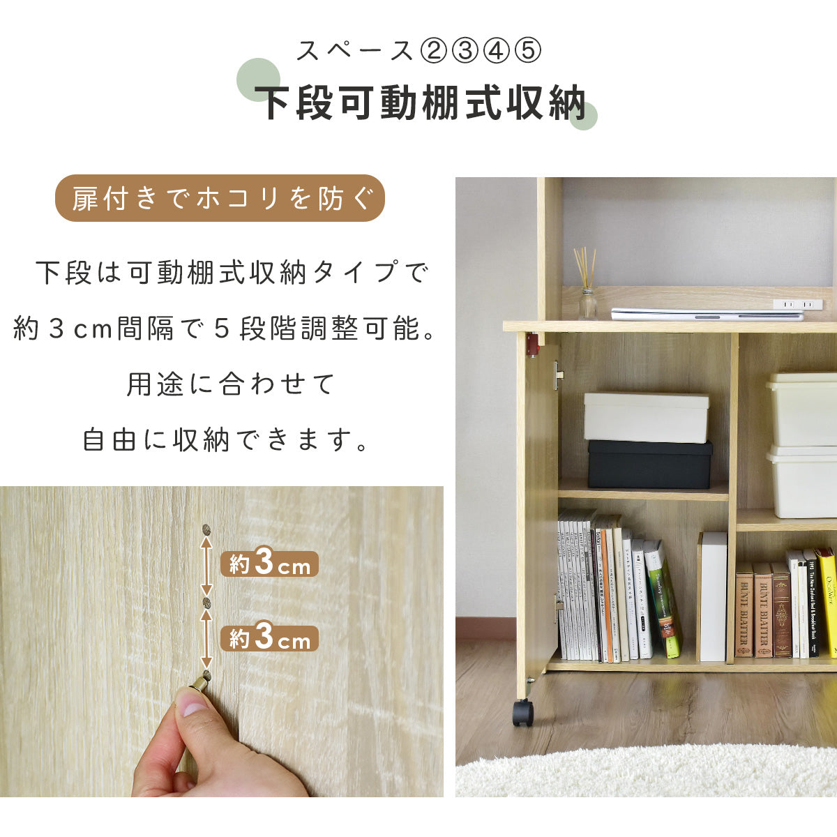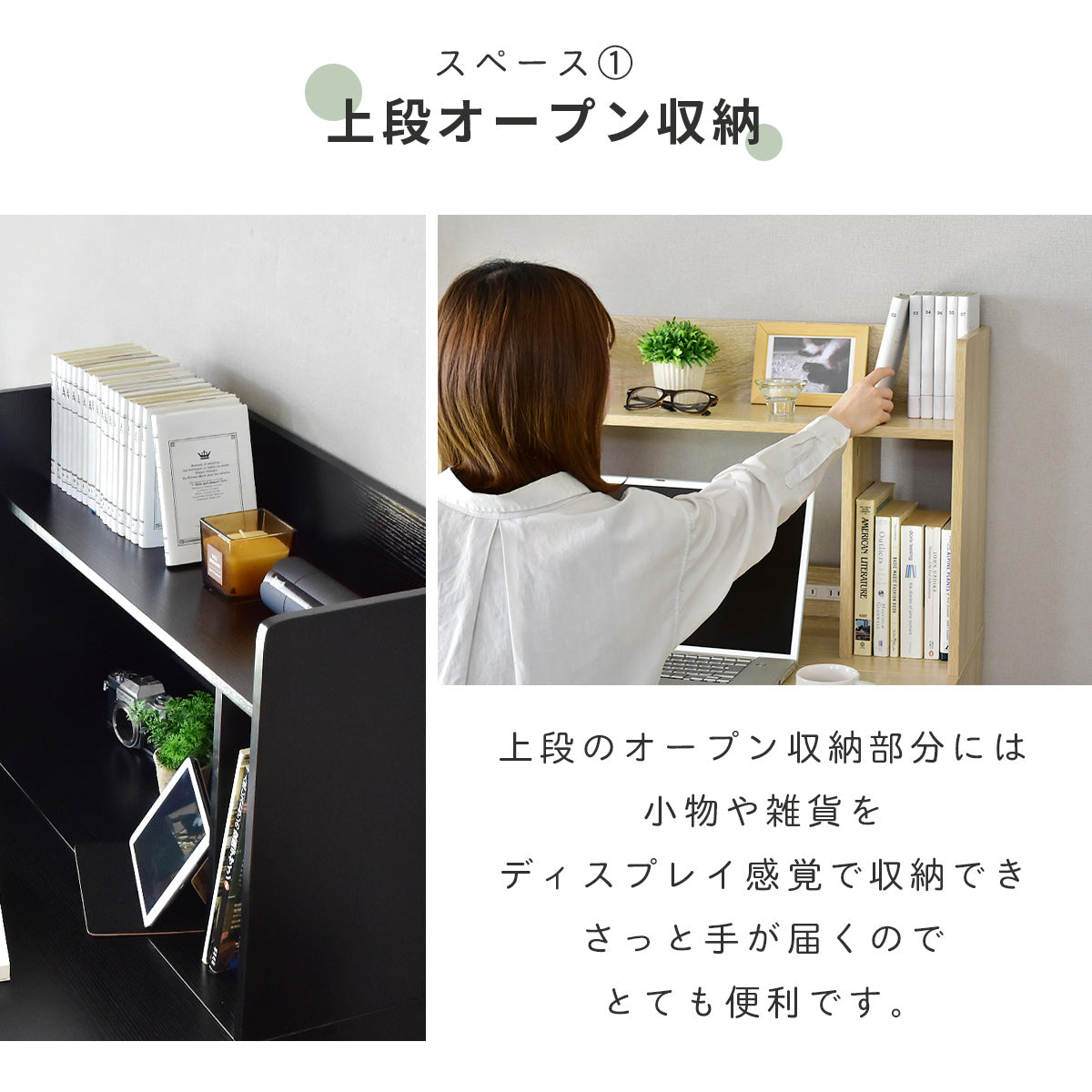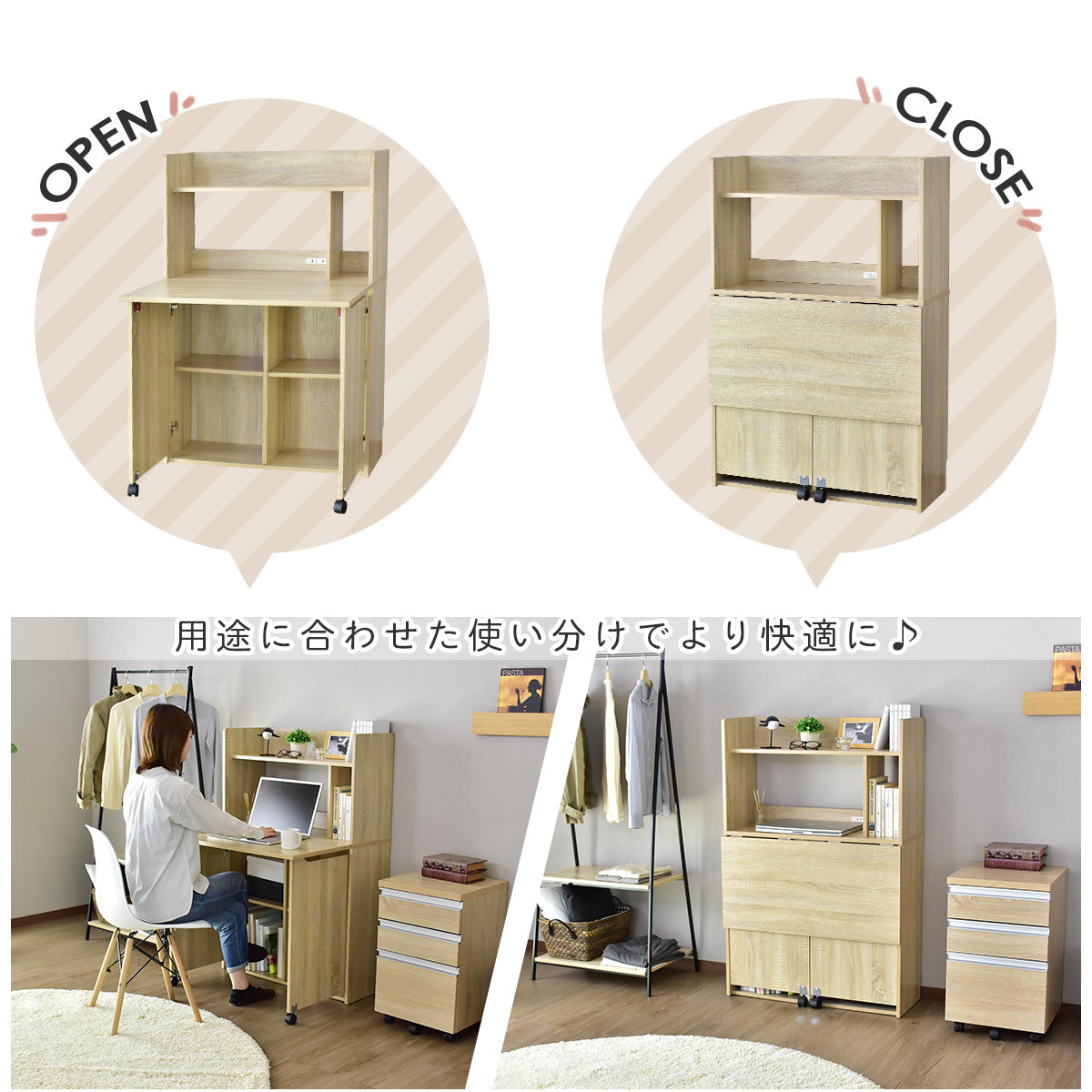 上段オープン収納、折りたたみ天板を開ければ下段は可動棚式収納。コンセント付き、コード穴、壁寄せできる巾木よけ、キズや汚れに強いメラミン加工です。