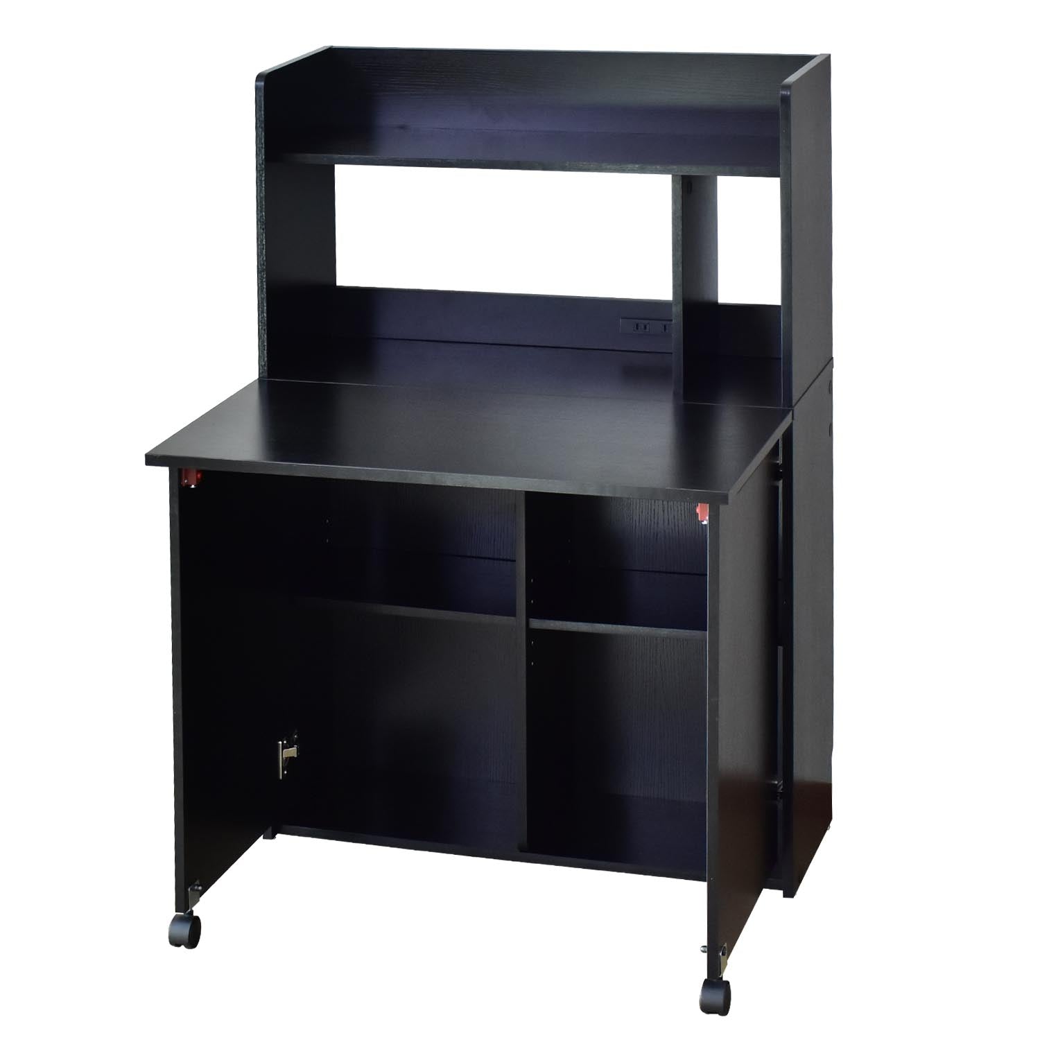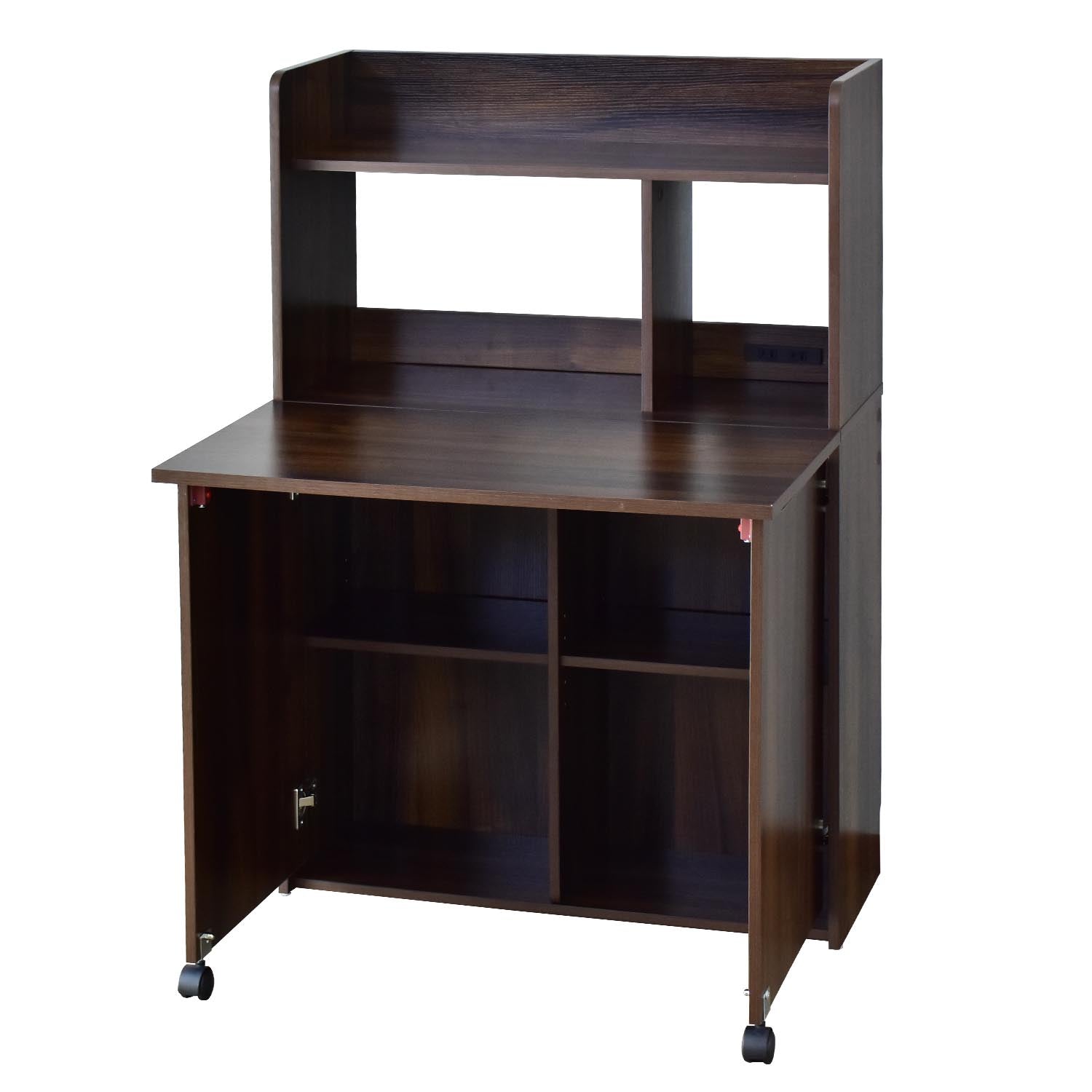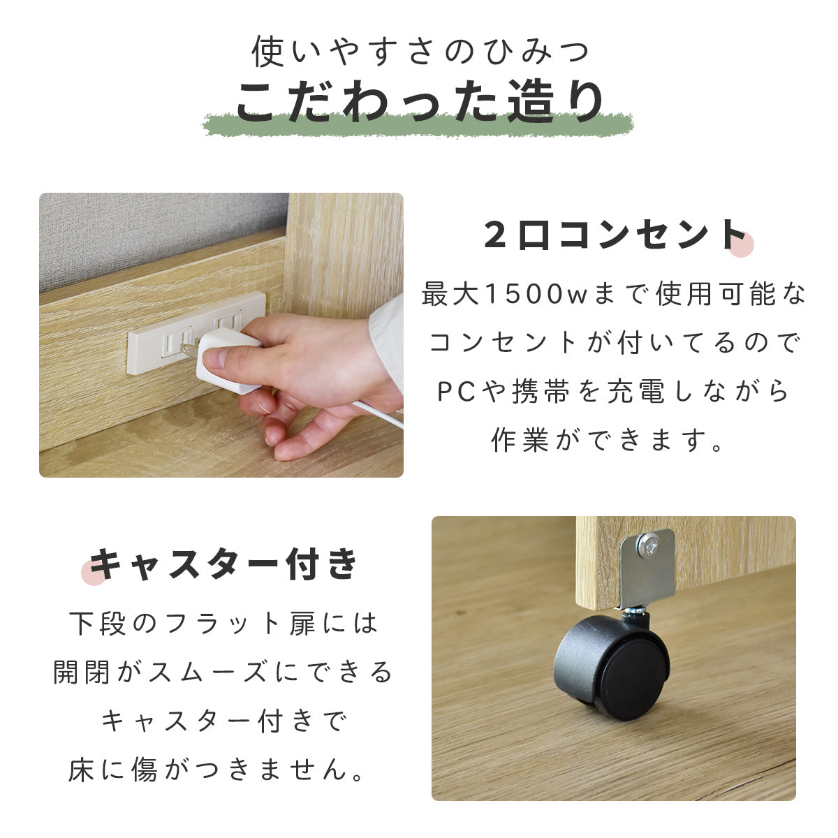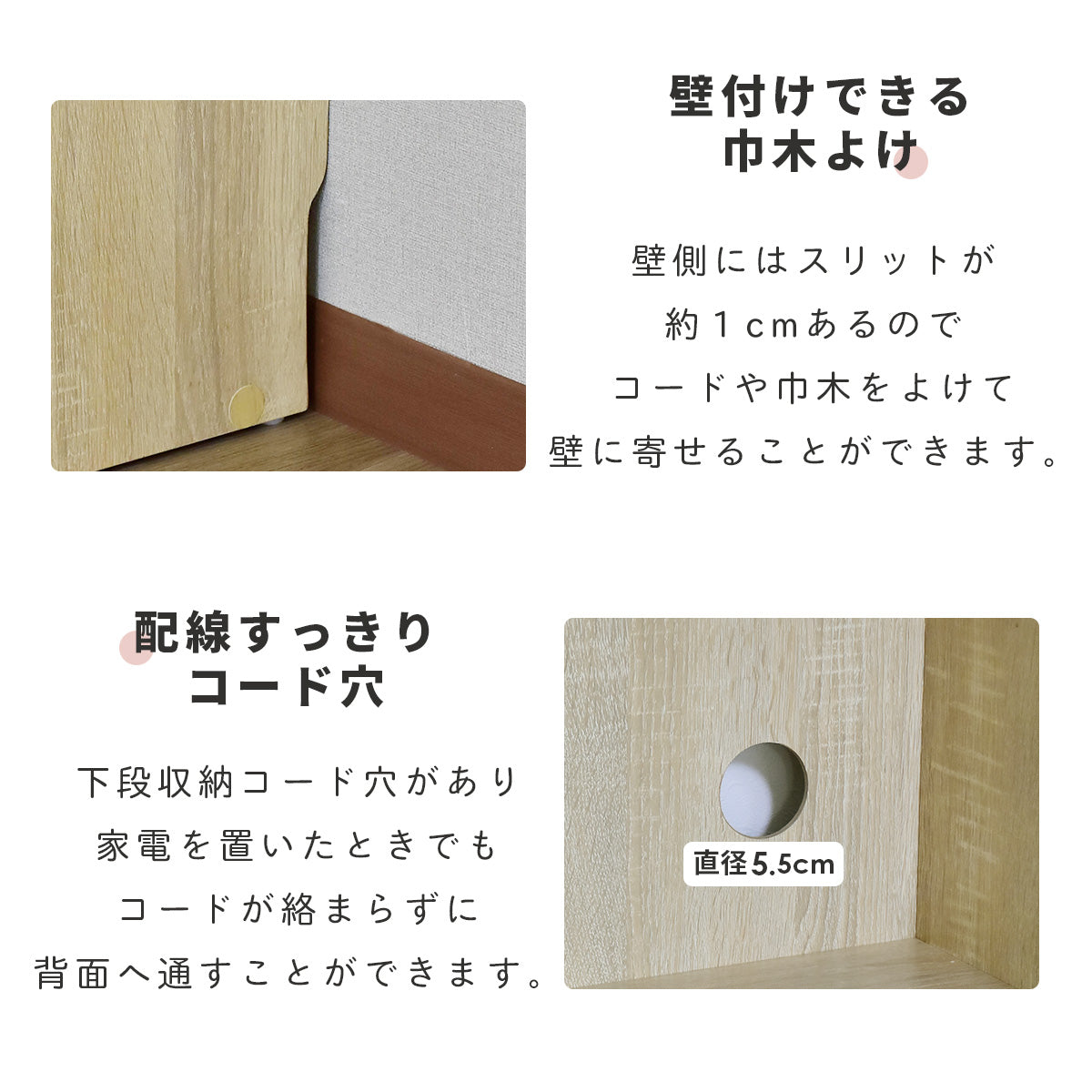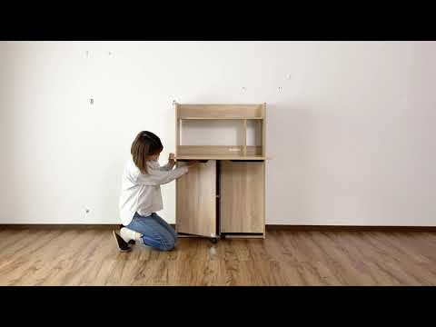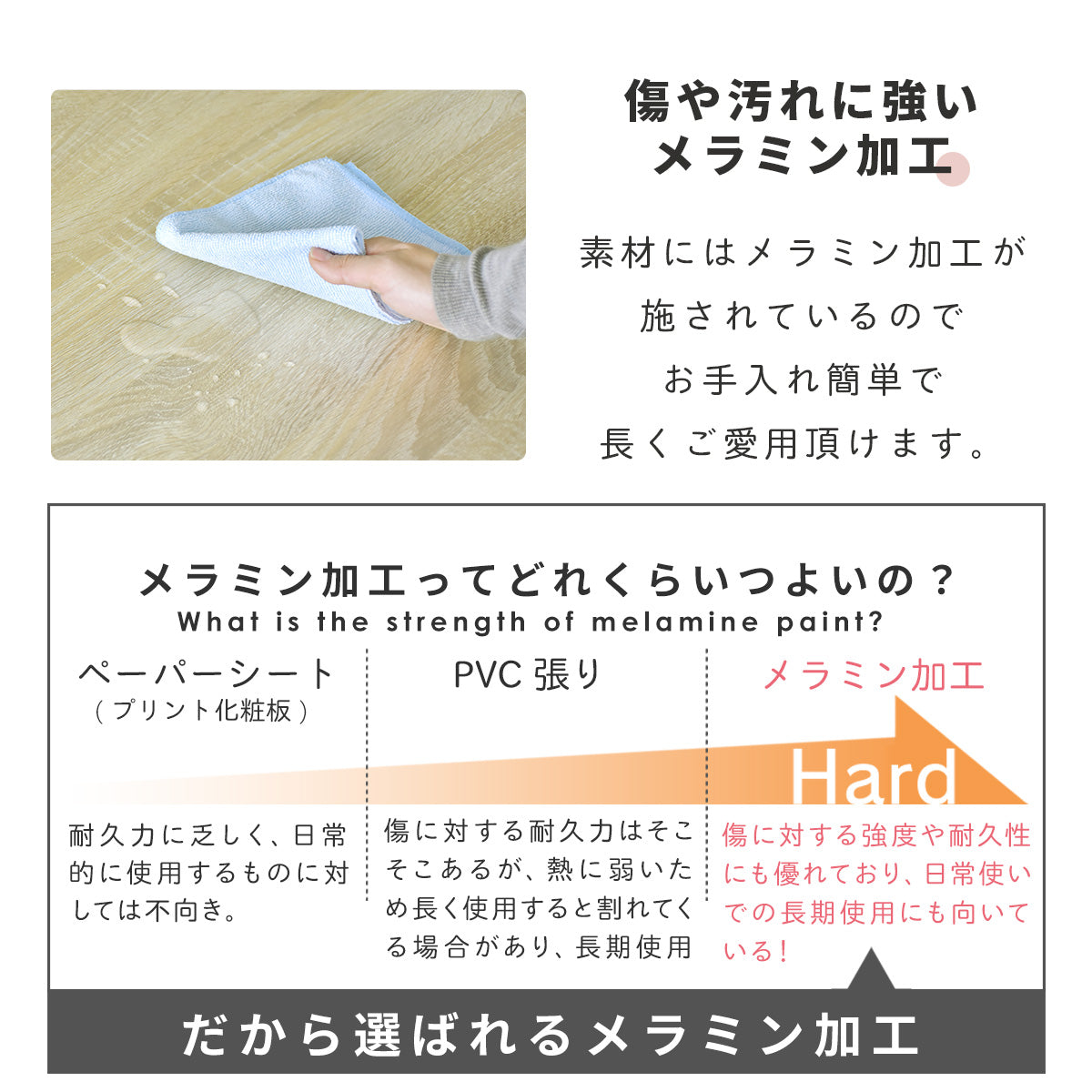 上段オープン収納、折りたたみ天板を開ければ下段は可動棚式収納。コンセント付き、コード穴、壁寄せできる巾木よけ、キズや汚れに強いメラミン加工です。
