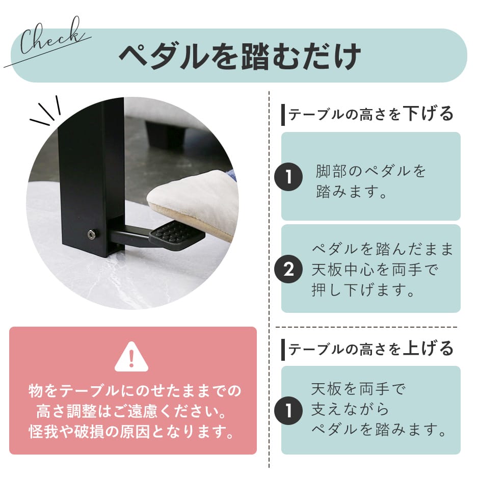 使いやすさにこだわった構造 | 実用性を追求した設計で、快適にお使いいただけます。ガス圧式の昇降機能は、スムーズな操作感で力の弱い方でも扱いやすい仕様。ペダルを踏むだけで簡単に高さを変えられ、使わないときは低くして収納することも可能です。また、天板の耐荷重にも優れ、安定感があるため、パソコン作業や書き物などもしやすい設計になっています。さらに、足元が広めに設計されているため、座る位置を自由に調整できるのもポイント。機能性と快適性を兼ね備えた、毎日使いたくなるテーブルです。 |