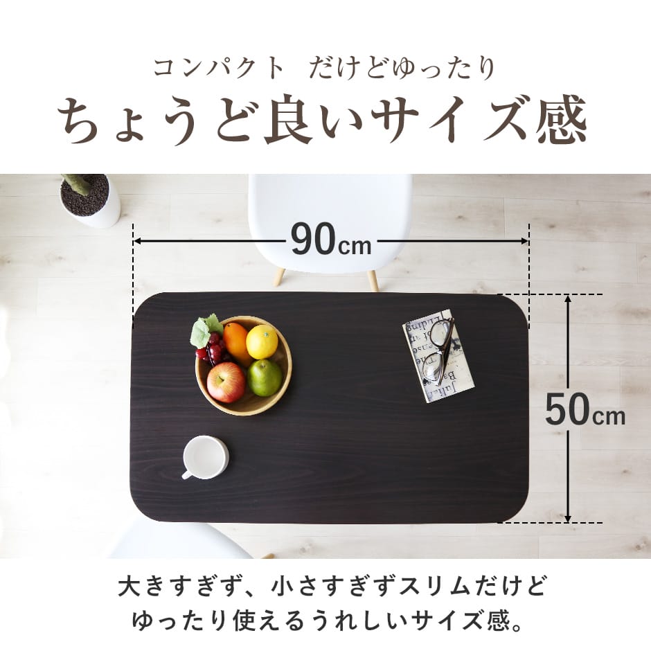 幅90cm×奥行き50cmのテーブルサイズは、一人暮らしの方やコンパクトなリビングに最適。小さすぎず、大きすぎない絶妙なサイズ感で、2人での使用やちょっとした作業スペースとしても快適にご使用いただけます。