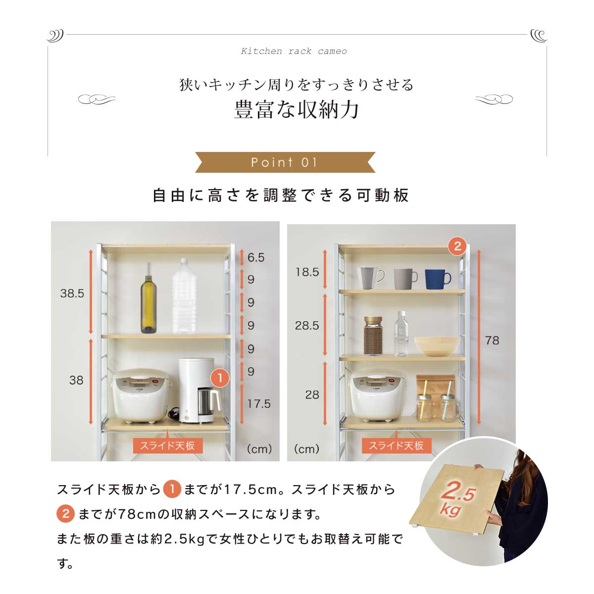 炊飯器やケトルを置けるスライド天板は24.5cm手前に引き出せるため、使用時のストレスを軽減。耐荷重最大8kgの頑丈な構造で、重い家電を置いても安定感抜群です。