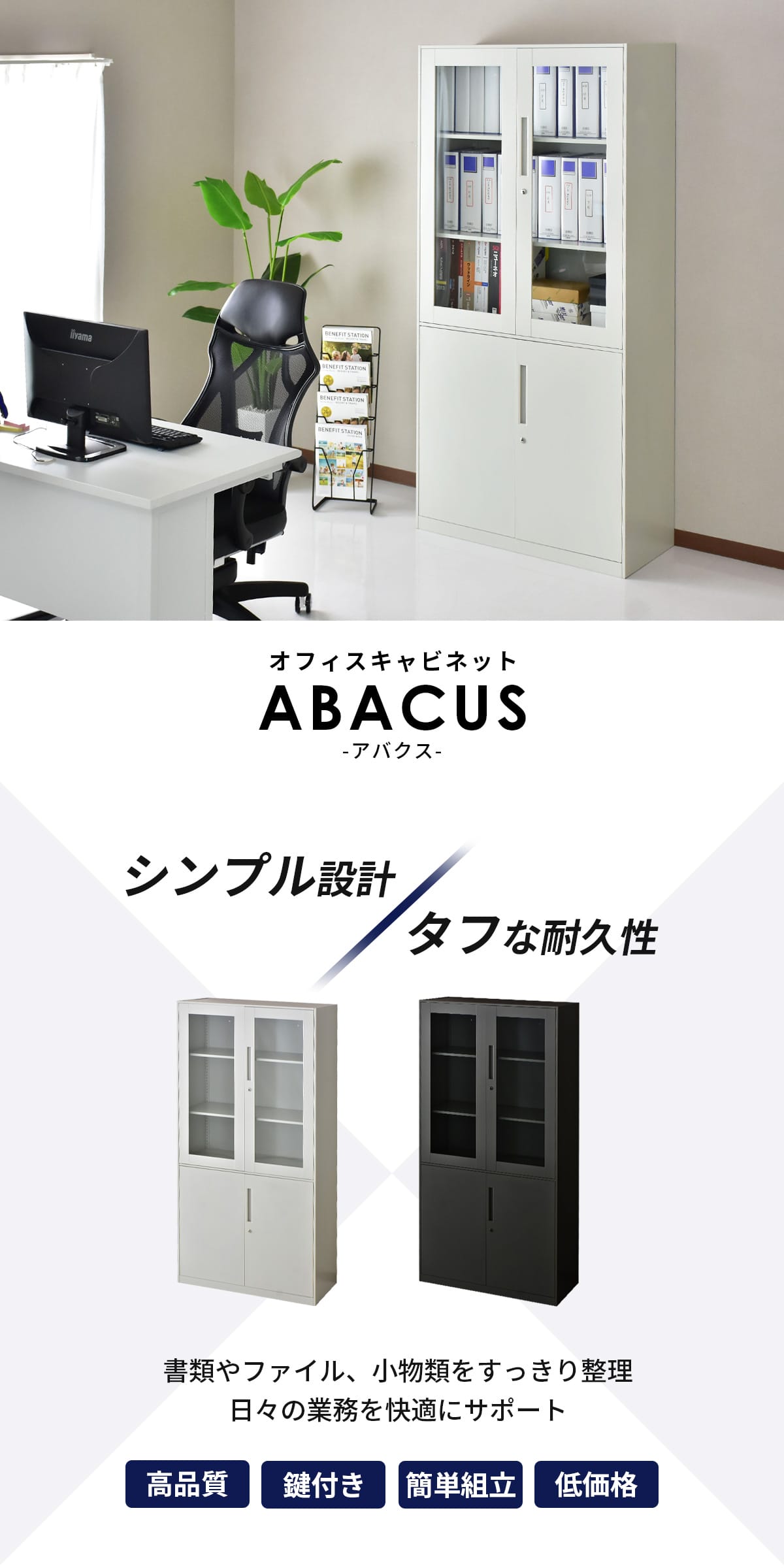 無駄のないスタンダードデザインのオフィスキャビネット「アバクス」。上段は中身がひと目で確認できる強化ガラス扉仕様。下段は収納物をすっきり隠せるスチール扉設計で、見せる収納と隠す収納を使い分けられます。鍵付きで重要書類も安心保管。粉体塗装のスチール製で耐久性にも優れ、複数台を並べれば空間を整然と演出します。