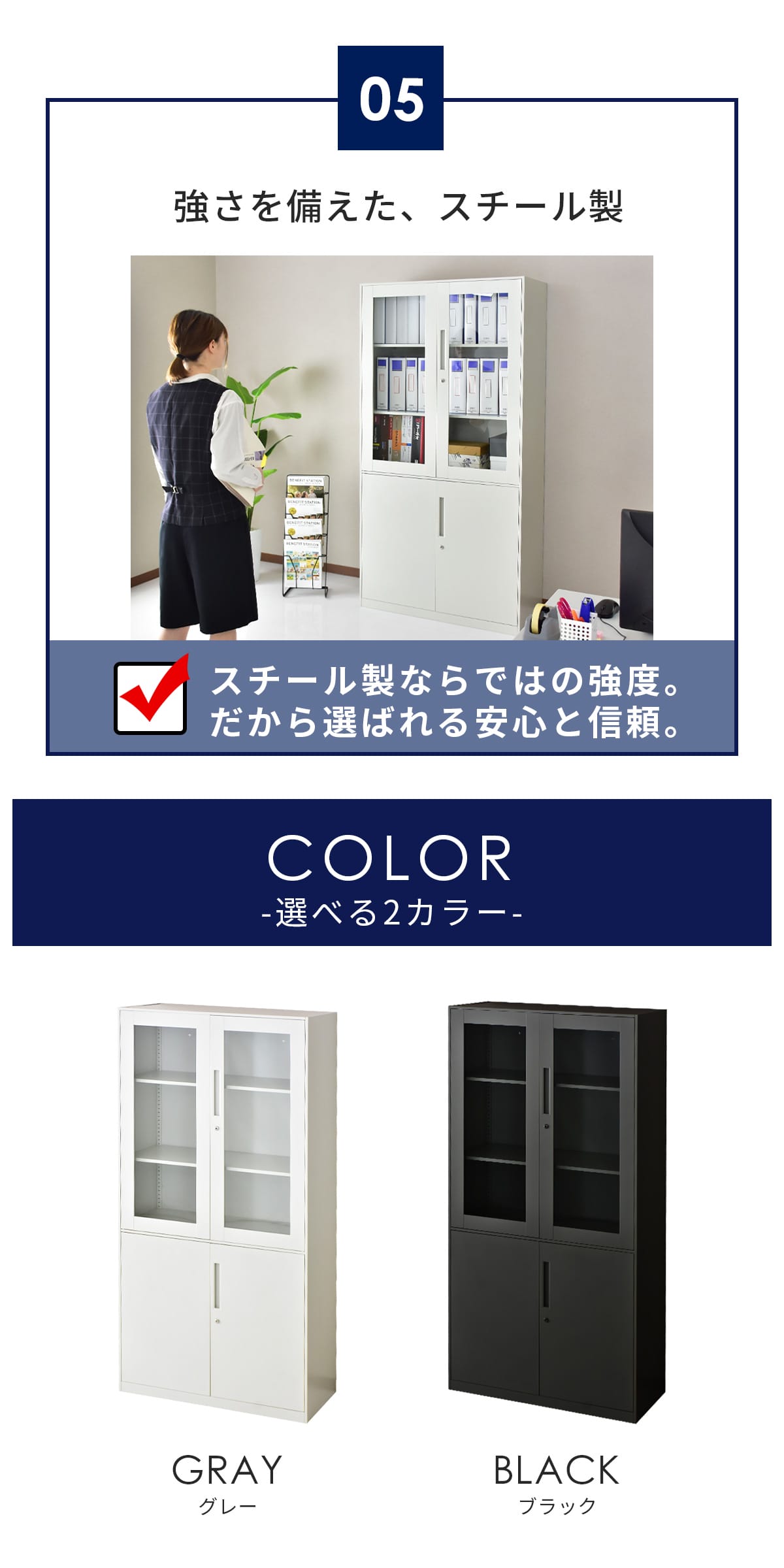 カラーは空間を引き締めるブラックと、圧迫感を抑えたグレーの2色展開。どちらも無機質で洗練された印象を与え、オフィスはもちろん、施設やバックヤードにもなじみやすい定番カラーです。用途や設置場所に合わせて選べます。