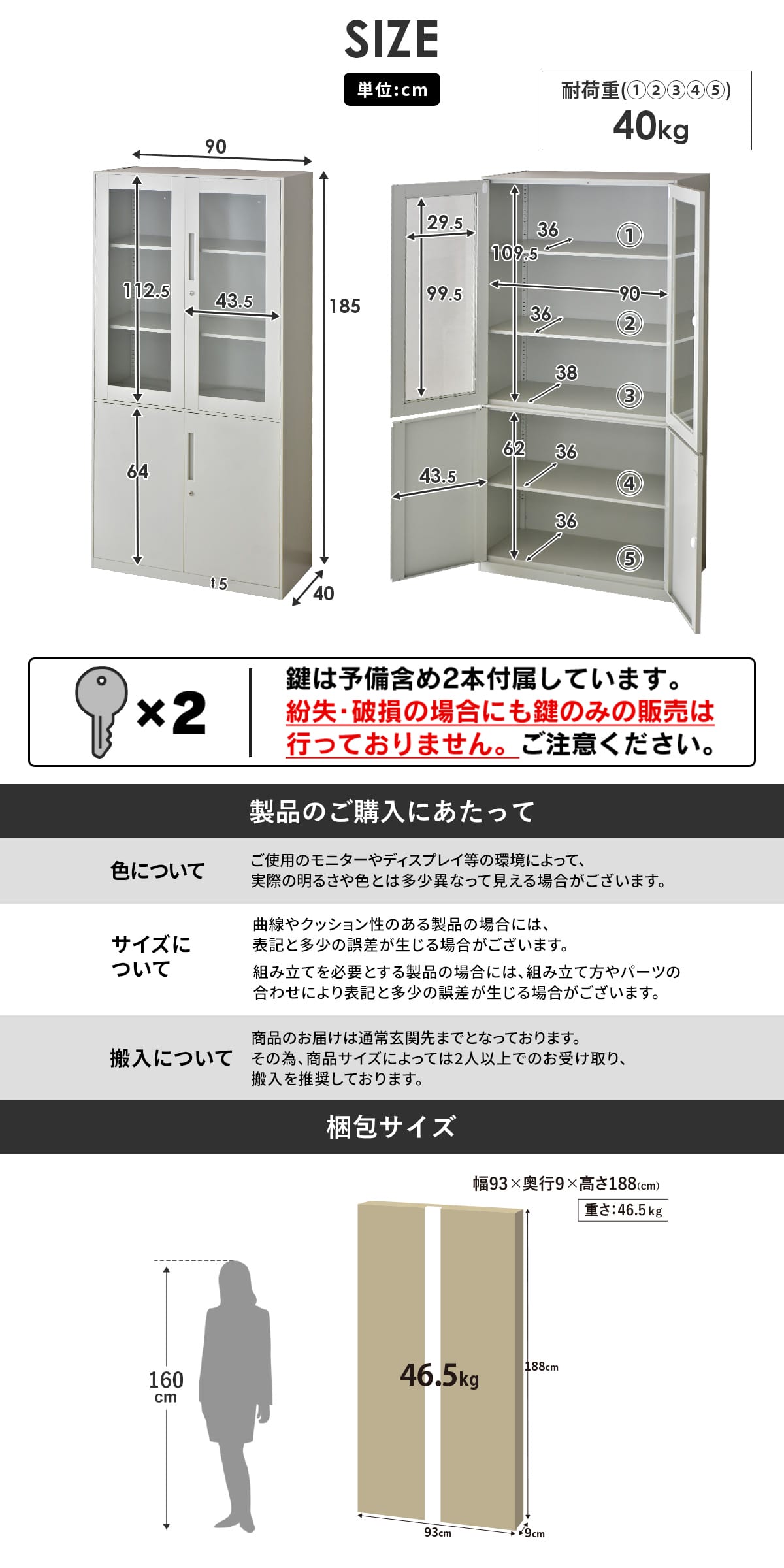 | 備 考 | ※付属の鍵は上段・下段共通です。 ※こちらはお客様組み立て商品となります。 ※他商品との同梱は出来かねます。 ※組み立て方や個体差により、サイズ・重量表記と多少の差異が生じる場合がございます。 ※ご使用のモニターやディスプレイ等の環境によって、実際の明るさや色と多少異なって見える場合がございます。 ※その他、記載事項ご確認の上ご注文ください。 |