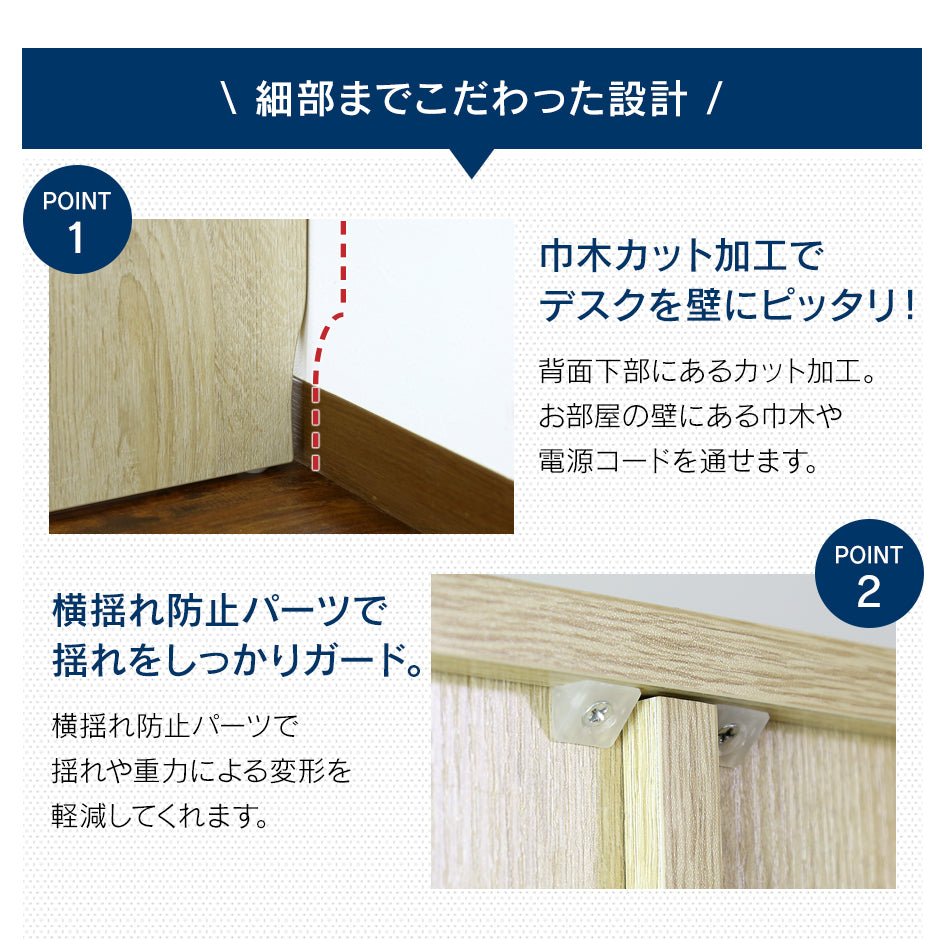足元も無駄にせず収納スペースに。デッドスペースになりがちな足元にも収納可。また、背面下部にある巾木カット加工により、壁寄せ対応・電源コードも通せます。