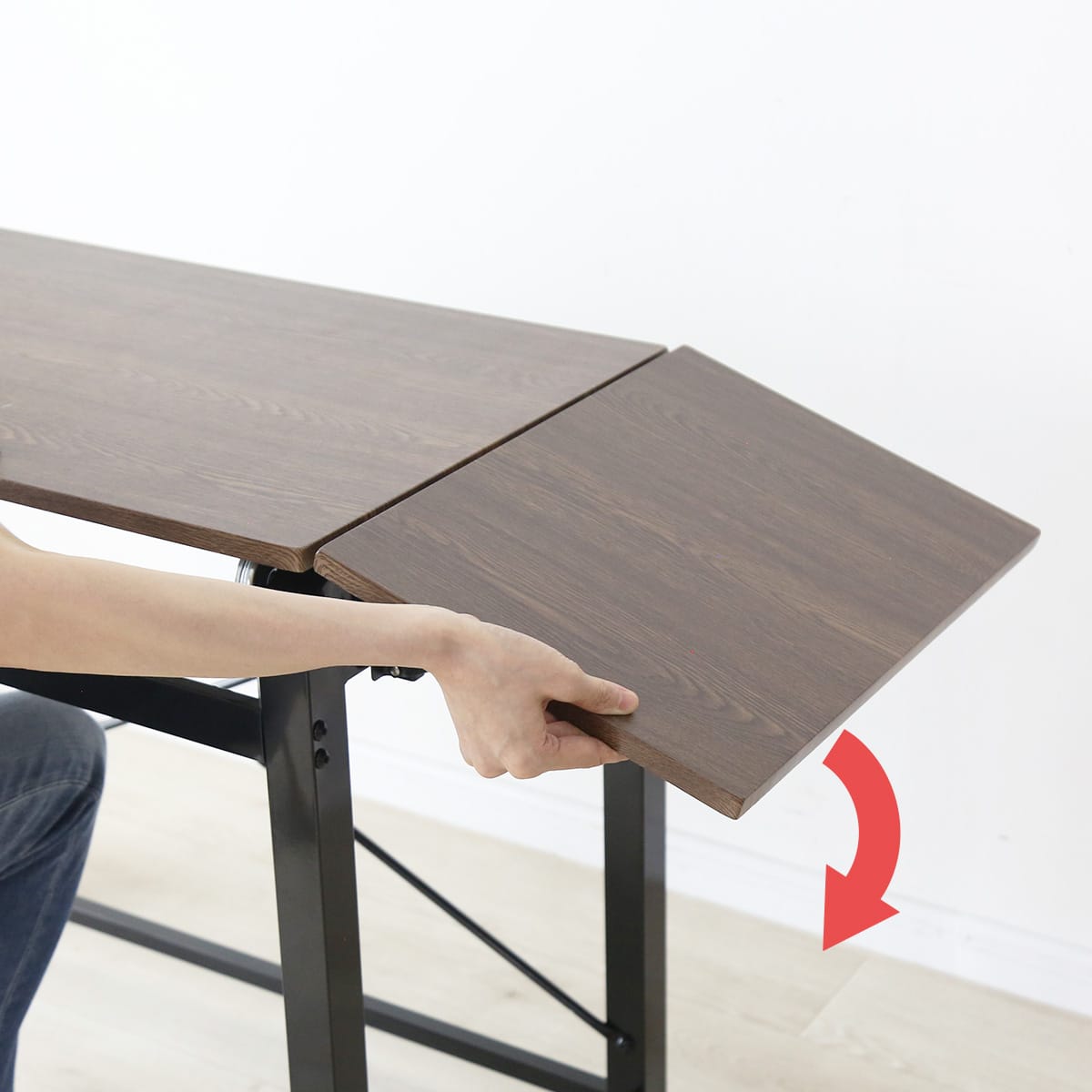 天板を傾斜させると、ノートパソコンや資料が滑り落ちてしまうのでは?と不安になる方も多いですが、本製品はその点も安心です。天板の下部にはストッパーが付いており、傾斜させても物が安定して置ける設計になっています。資料やタブレット、楽譜などがずり落ちる心配がないため、安心して角度調整を活用できます。特にイラストレーターやデザイナー、学生の勉強用としても安心。細かい作業や長時間の使用に配慮した実用性の高い工夫が盛り込まれています。