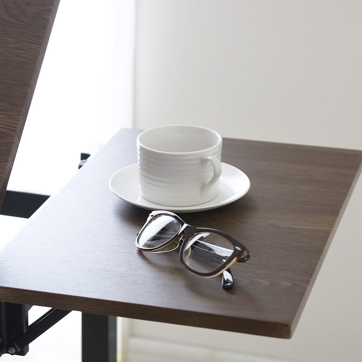 本製品のサイドテーブルは、必要な時だけサッと展開し、不要な時にはレバー操作で簡単に畳める便利な仕様です。レバーを軽く操作するだけでスムーズに開閉可能で、女性やご年配の方でも安心して扱えます。使用時にはノートパソコンや資料、さらにはマグカップを置くスペースとしても活躍し、デスクワークの快適さを高めます。コーヒーやお茶を片手に仕事や勉強に集中でき、ちょっとした休憩時間にも便利です。不要な時はコンパクトに畳めるため、部屋のレイアウトを邪魔せず、ワンルームや限られた空間でもスッキリと設置可能。必要に応じて作業スペースを拡張し、不要な時はすぐに収納できるので、省スペースと実用性を両立したデザインです。