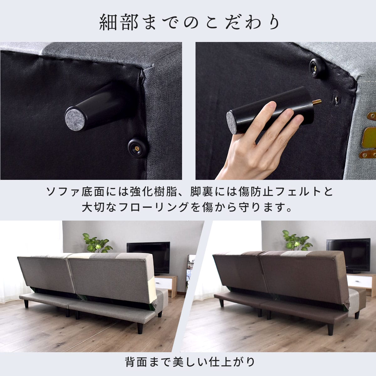 左右それぞれ独立して調整できる3段階リクライニングを採用し、座る人一人ひとりに合わせた快適な姿勢をサポートします。さらっと心地よいファブリック生地は季節を問わず一年中快適。さらに脚裏には床を傷つけにくいフェルトを付属し、日常使いにも安心できる仕様に仕上げました。デザイン性と機能性を兼ね備えた、こだわりのソファです。