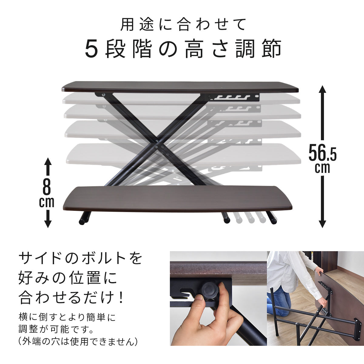 この昇降テーブルは、5段階の高さ調節が可能。座椅子と組み合わせてローテーブルとして使うのも良し、ダイニングテーブルの高さで食事を楽しむのも良し、デスクとして作業をするのも良しと、シチュエーションに合わせて自由に変更できます。高さ調節は簡単なレバー操作で行えるため、力の弱い方でもスムーズに調整可能。高さを固定すればしっかり安定し、快適に使用できます。リビング、オフィス、ショップなど、さまざまな場面で活躍する多機能テーブルです。