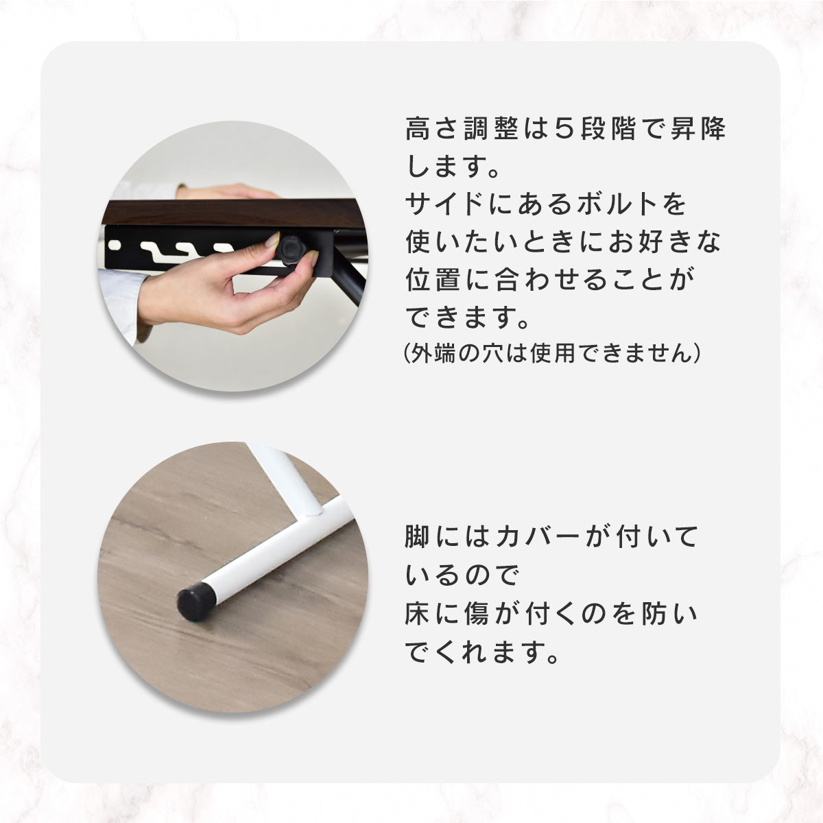 この昇降テーブルは、多段で折りたたんで収納できるため、使わないときに場所を取りません。ワンルームの一人暮らしや、新生活で限られたスペースを有効活用したい方に最適。折りたたみ機能により、掃除の際にも簡単に動かせるため、お部屋を清潔に保ちやすいのも嬉しいポイント。使いたいときにサッと広げて、使わないときはスリムに収納できるので、狭いお部屋でもストレスなくお使いいただけます。