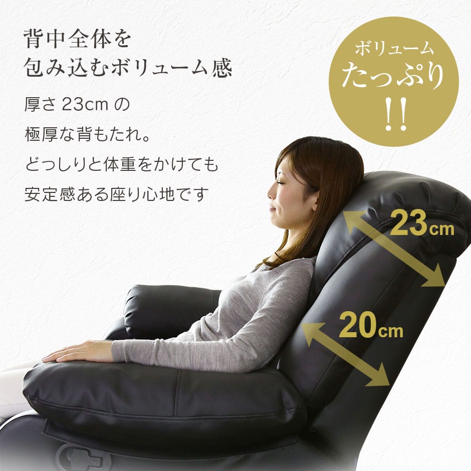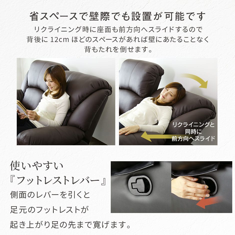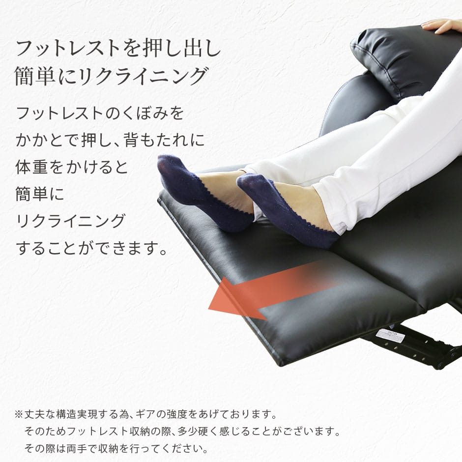 背もたれは最大140度までリクライニング可能。省スペース設計のため、壁際に設置してもスムーズに角度調整ができます。フットレストはレバーを引くだけで簡単に操作でき、足を伸ばして全身を預けるようなリラックススタイルを手軽に楽しめます。