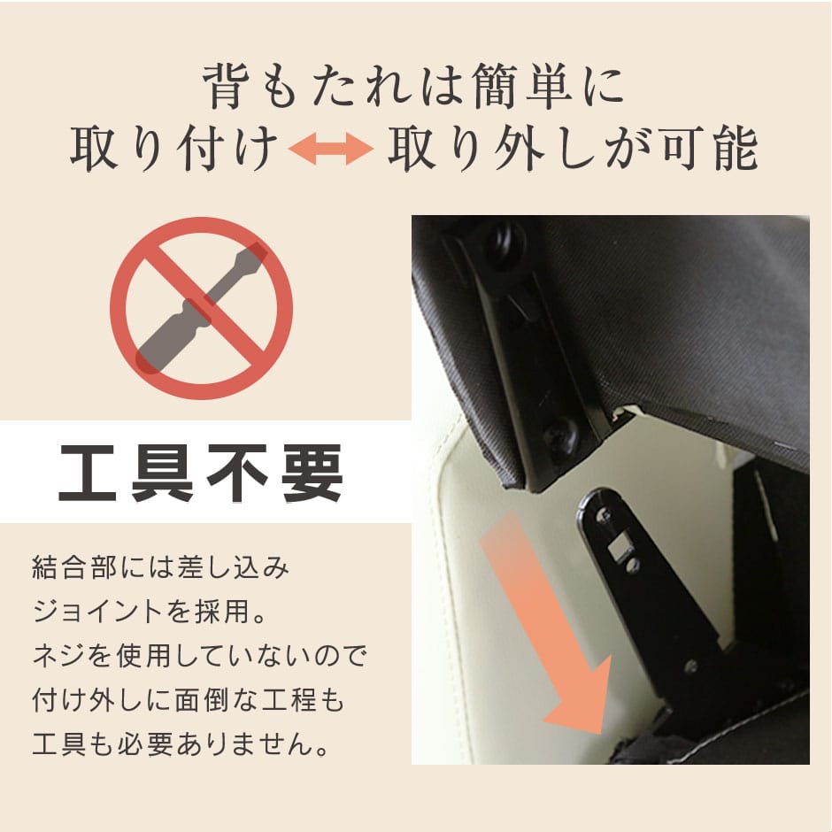 張地はPUレザー3色、ファブリック1色から選べる仕様。背面まで同一生地で仕上げているため、壁付けはもちろん、空間の中央に置いても美しく設置できます。背もたれは差し込むだけの簡単脱着式で、搬入や設置もスムーズに行えます。