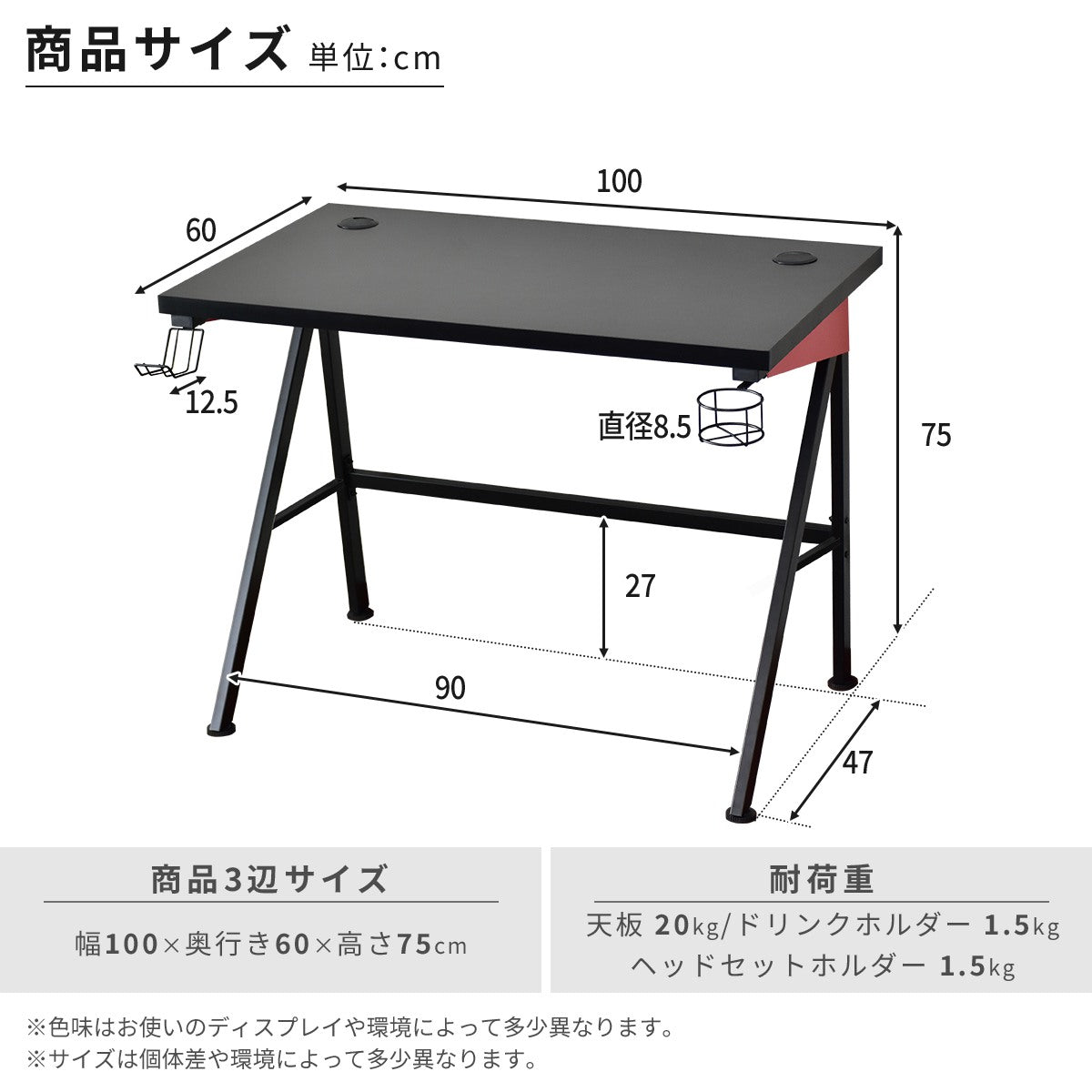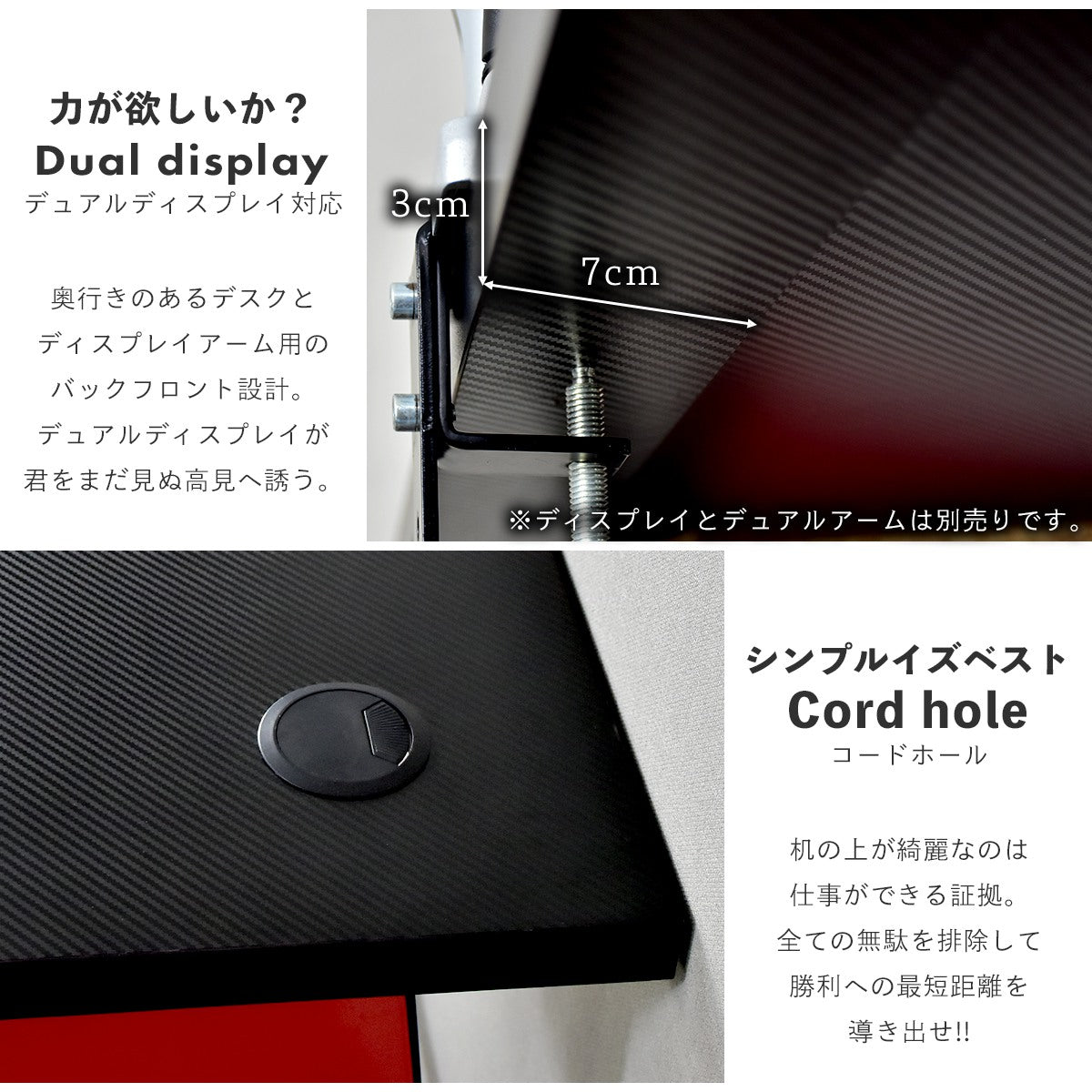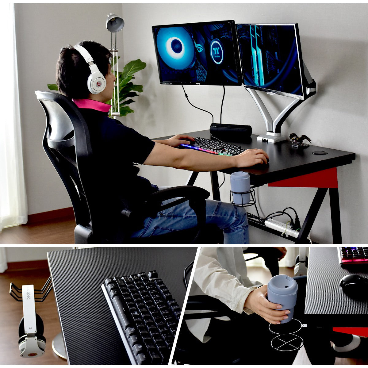 【各種機能】デュアルディスプレイに対応した天板幅100cm。コードホールを2個、ヘッドセットホルダーとドリンクホルダーを搭載しました。