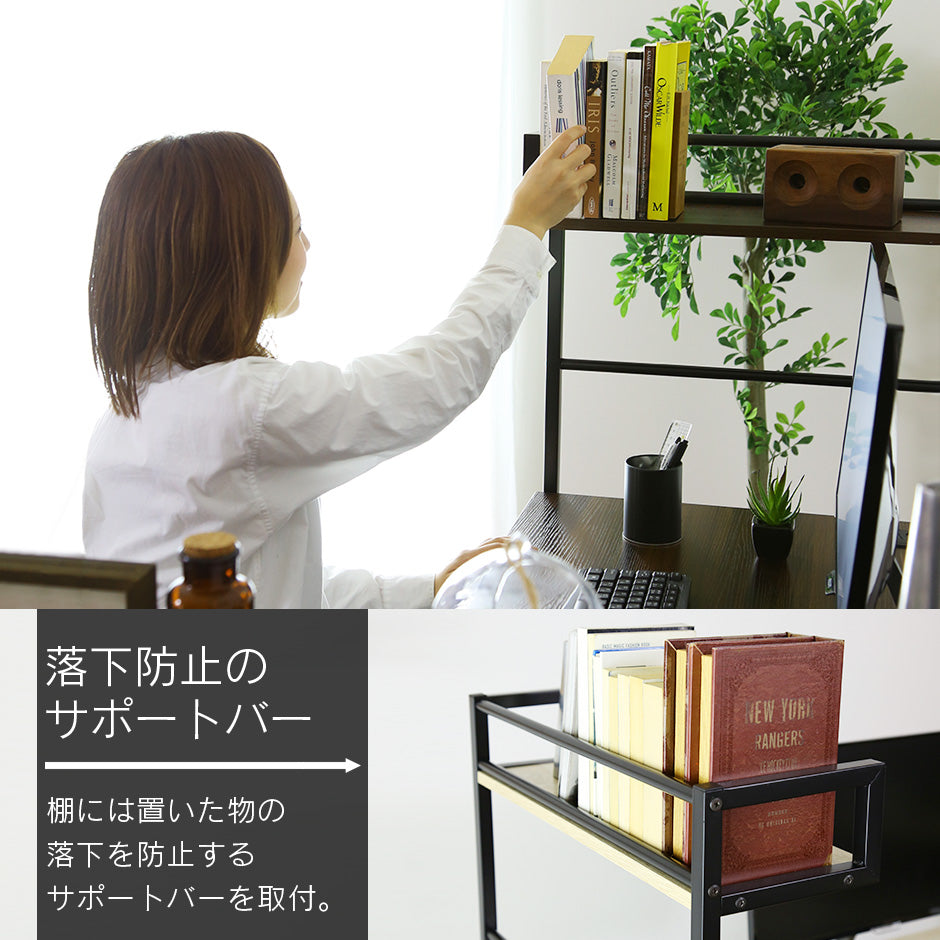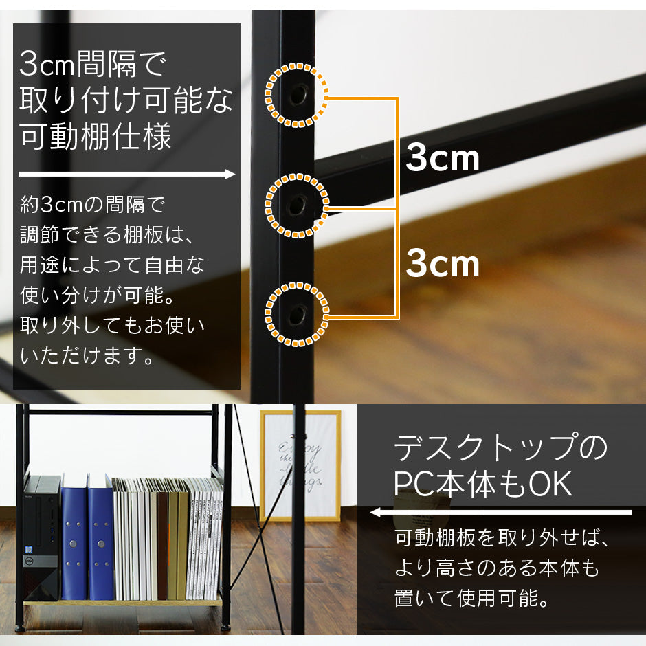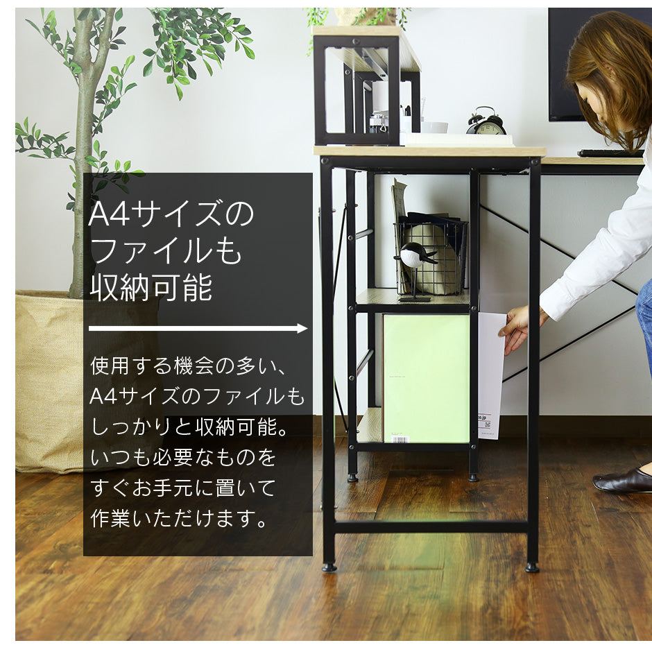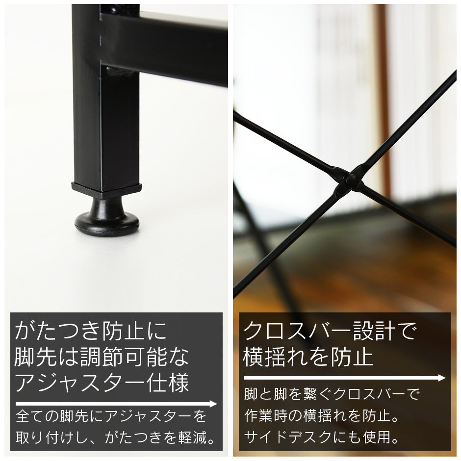 デスクには、作業に必要なアイテムをしっかり収納できるラックが付いており、デスク周りを常に整理整頓できます。デスク上にはノートパソコンやデスクトップPC、プリンターなどを配置しても十分な広さを確保しながら、サイドラックには書類や本、小物類を収納することが可能です。収納ラックはフリーレイアウトが可能なため、左右どちらにでも設置でき、使い勝手に合わせたカスタマイズができます。デスク下には足元のスペースを十分に確保しており、キャビネットや収納ボックスを置いてさらに整理整頓をしやすくできます。