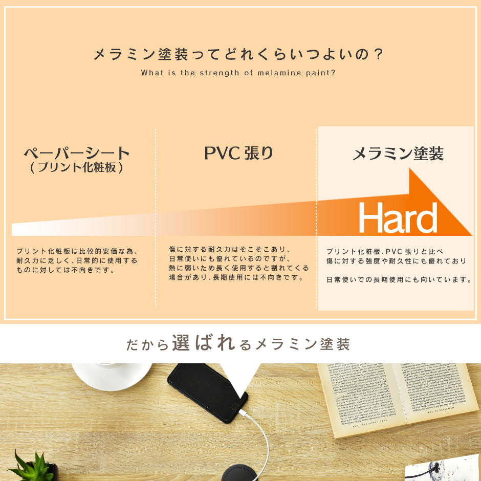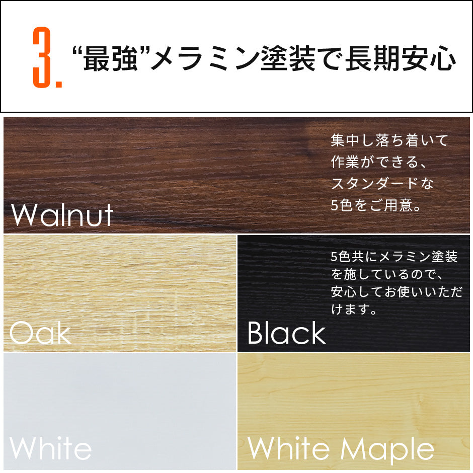 天板は120×60cmのワイド設計で、ゆったりと作業ができる広さが確保されています。パソコン作業や勉強、書き物など、さまざまな用途に対応可能です。さらに、デスクの表面は耐久性の高いメラミン加工が施されており、傷や汚れに強く、長期間にわたって美しい状態を維持できます。飲み物をこぼしてもサッと拭き取るだけで簡単にお手入れができるため、清潔な状態を保てるのもポイントです。また、木製デスクならではのしっかりとした質感があり、高級感のある仕上がりとなっています。