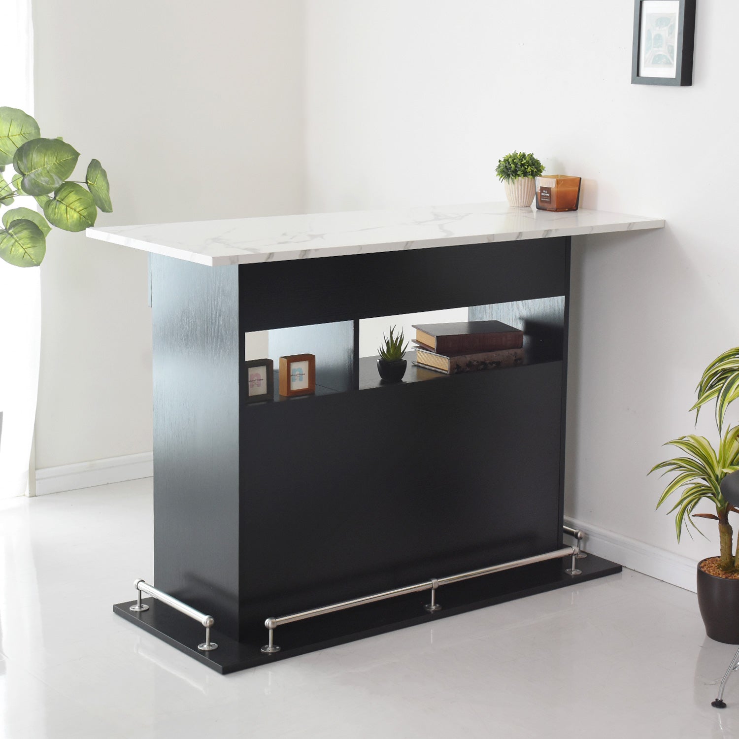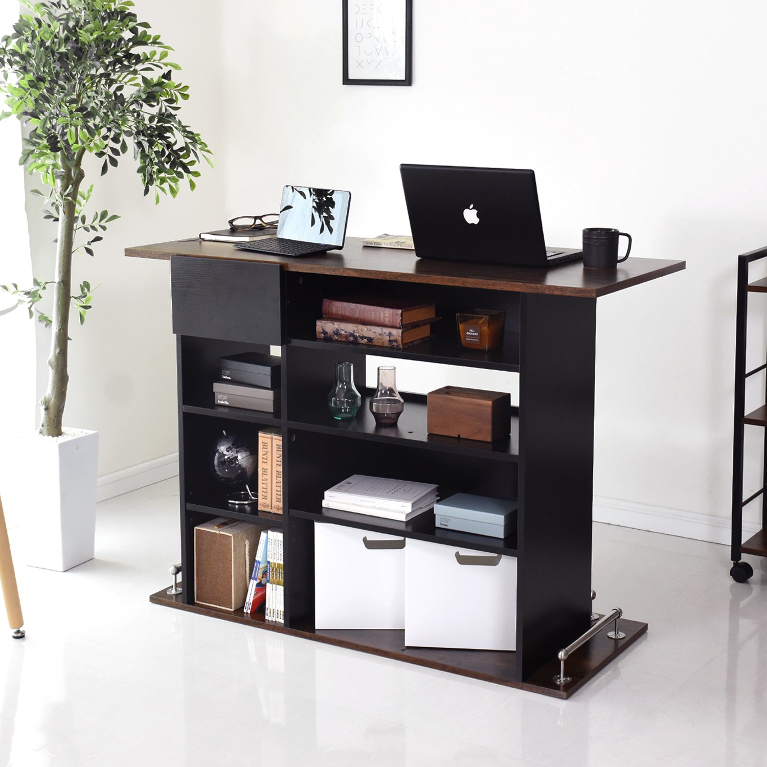 プラック基調のデザインが高級感を演出し、ヴィンテージと大理石調の天板がアクセントになったおしゃれなカウンターデスク「デューズベリー」。オープンな収納スペースと便利な引き出し完備で、キッチンカウンターやバーカウンターとして幅広くご使用いただけます。