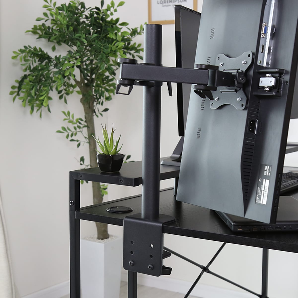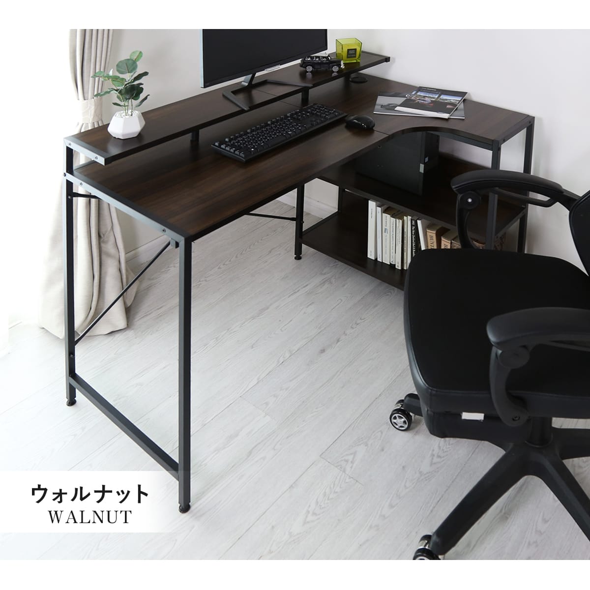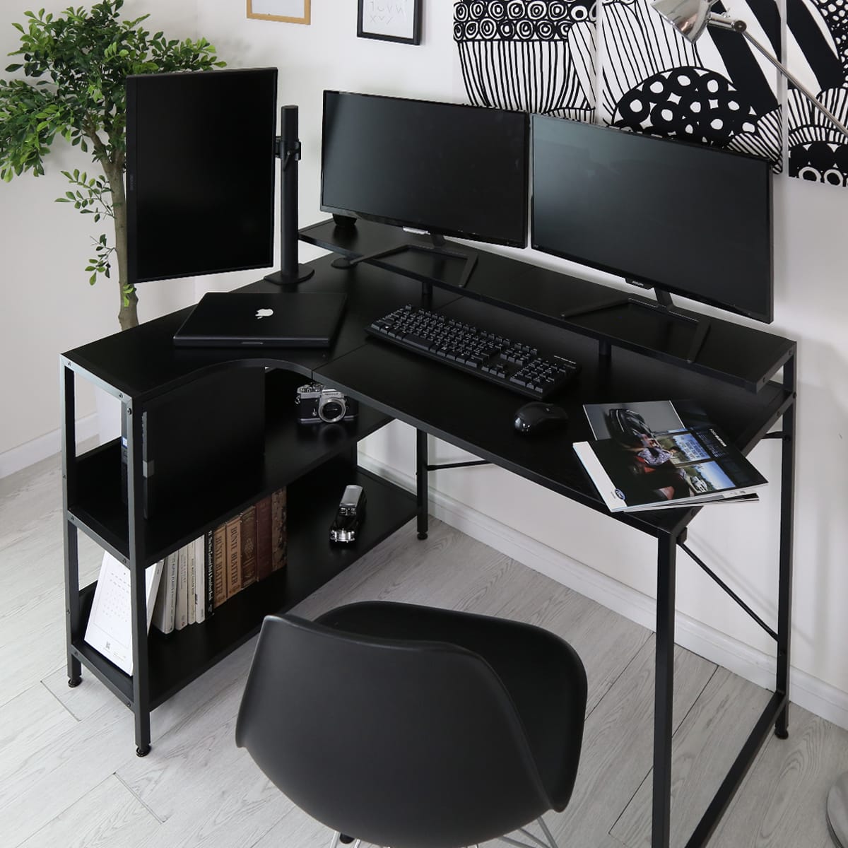 L字デスクならではの広いスペースを確保して複数のモニターで作業もおすすめ。モニターアームを使用することで作業スペースを広くすることができます。仕事だけでなく、ゲームや調べる事などを楽しむことが