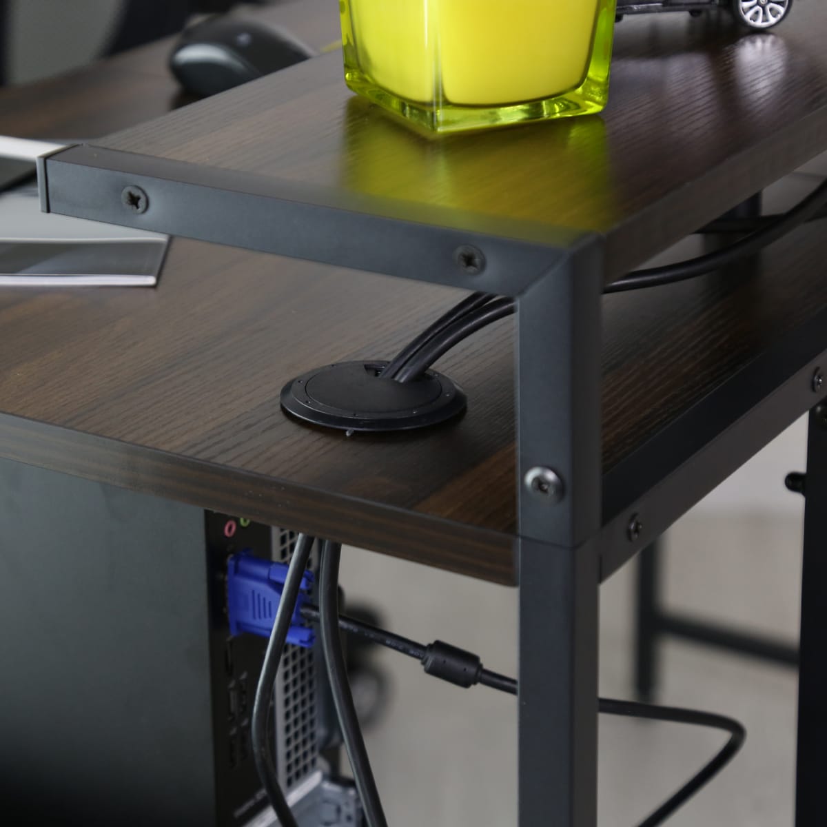 配線がまとまらずごちゃごちゃする悩みのある方は多いと思います。こちらのパソコンデスクは配線穴が付いていますのですっきり整理することができます。天板の目立たないところにあり、デスク回り
