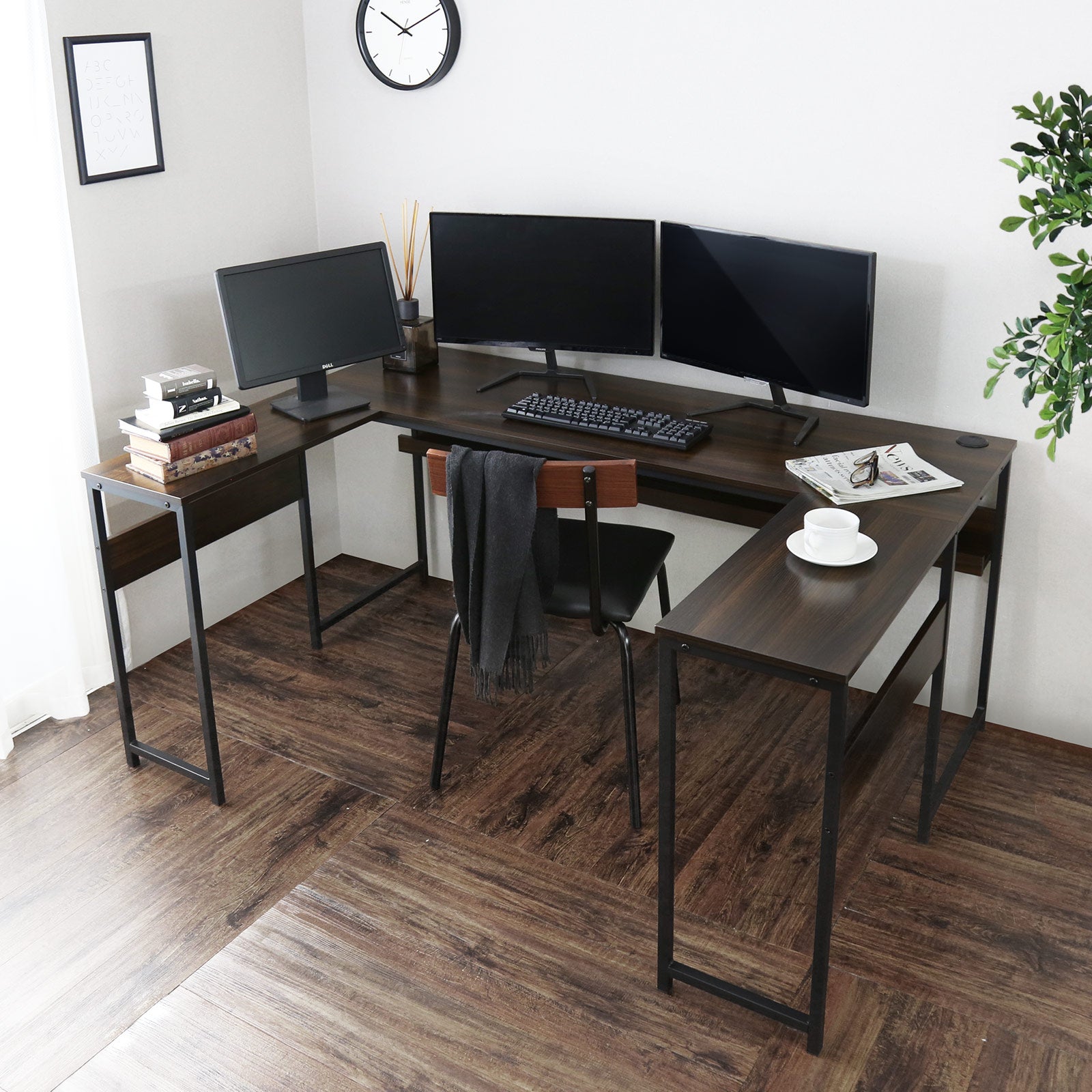 デスク「レプト」は、作業スペースを広々と使えるコの字型デザインを採用しています。幅160cm、奥行110cmという広い設計により、作業に必要なパソコンや書類をたっぷりと広げて配置でき、デュアルモニターなどの複数の機器を使用する方にも最適です。さらに、コーナーをうまく利用できる形状なので、ワンルームやコンパクトなオフィスにもすっきりと収まり、作業効率をアップします。L字デスクとしても使えるため、限られたスペースを有効に活用でき、作業を快適にサポートします。