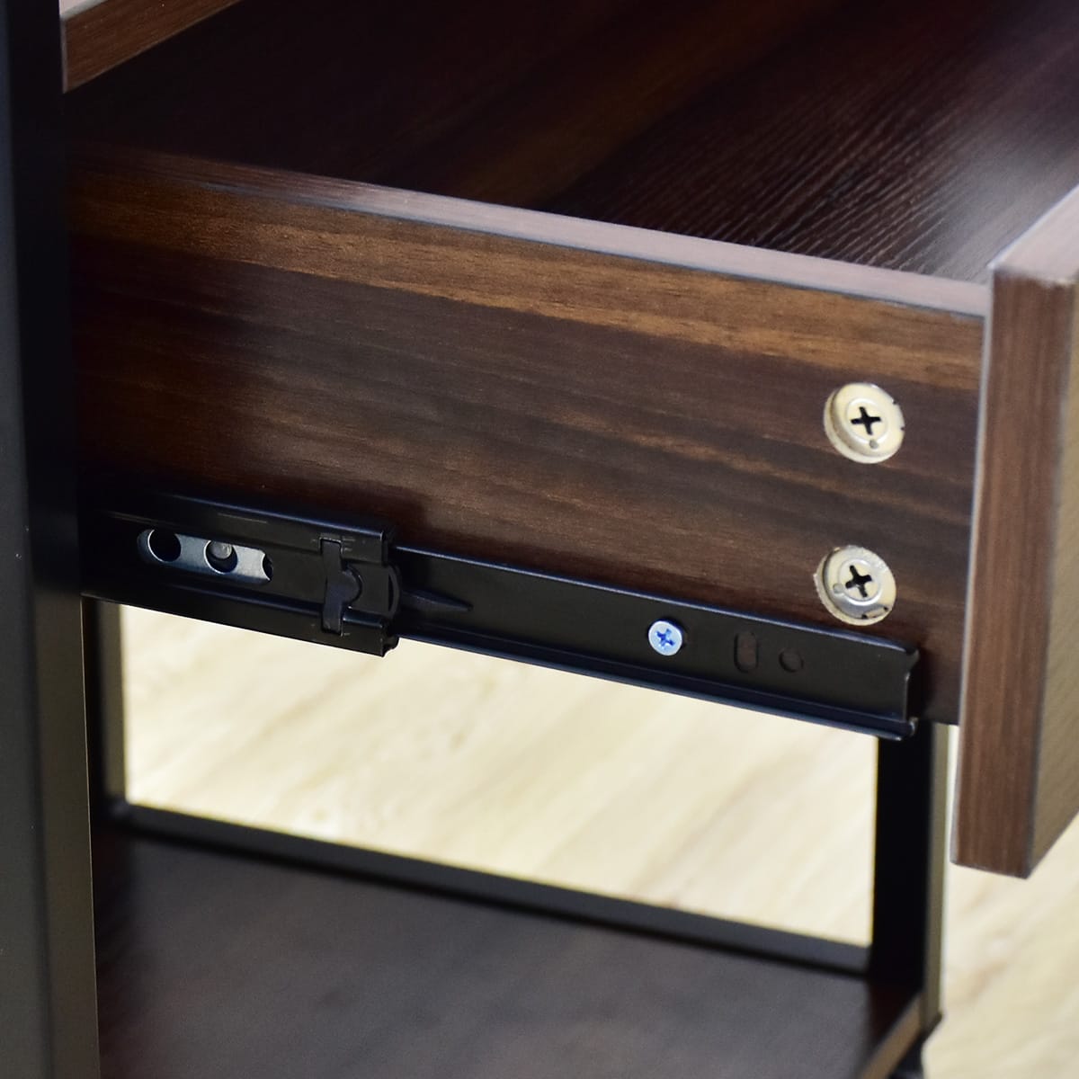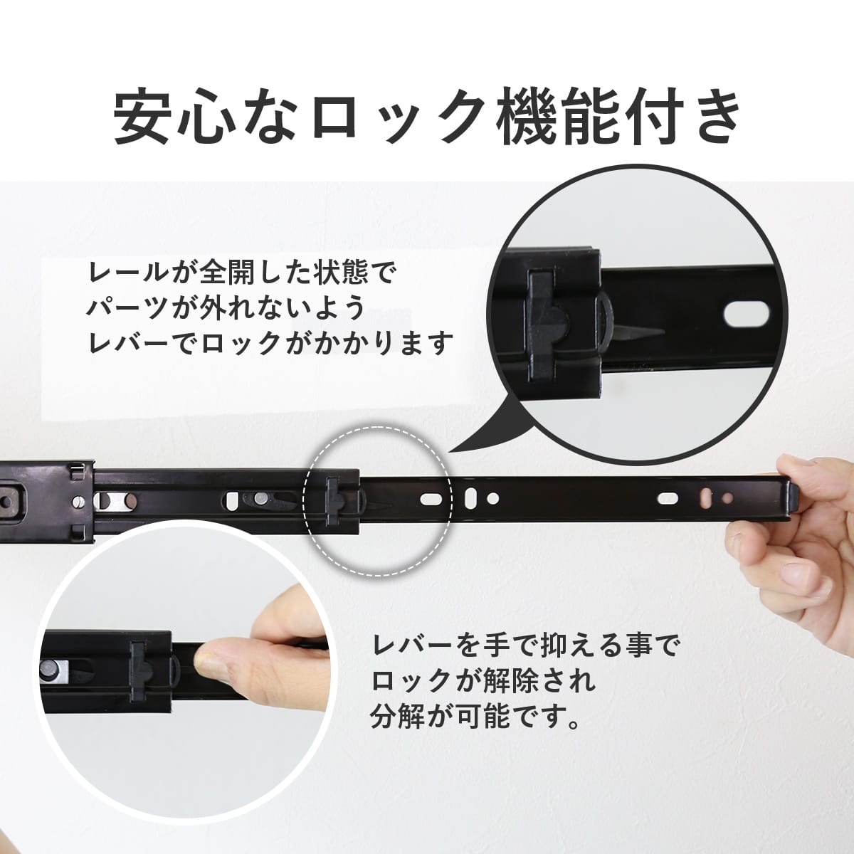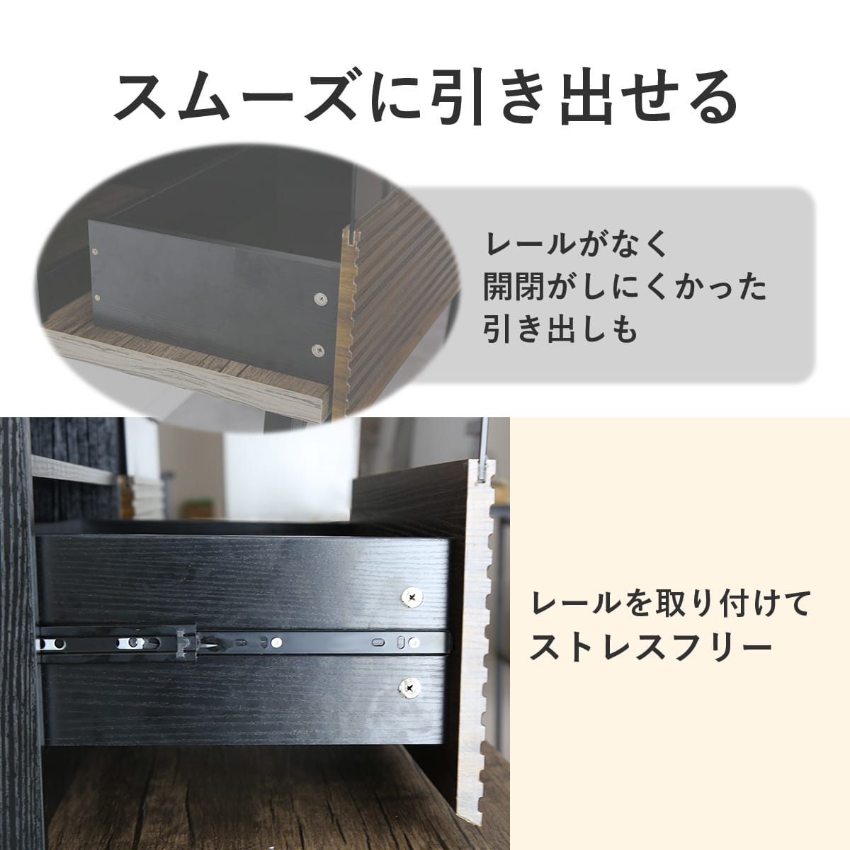 スライドレールは、スムーズな開閉を実現し、引き出しの使用感を向上させます。 さらに、全開に引き出した際に外れないロック機能が付いているため、小さなお子様がいるご家庭でも安心してご使用いただけます。家具の安全性を高めつつ、快適な使用感を提供します。