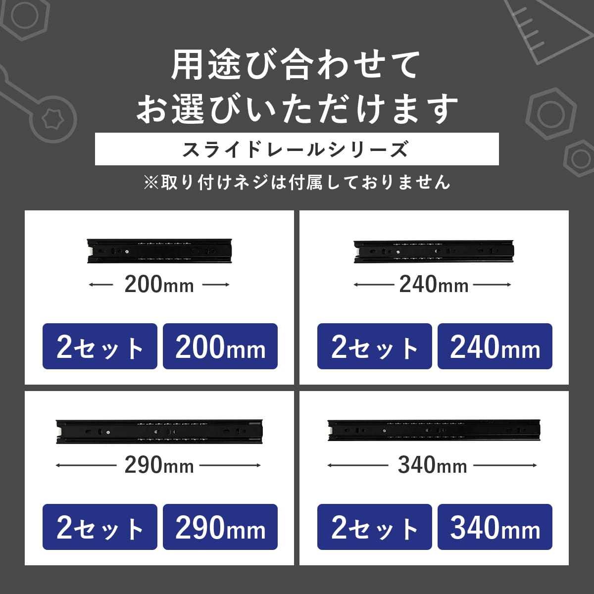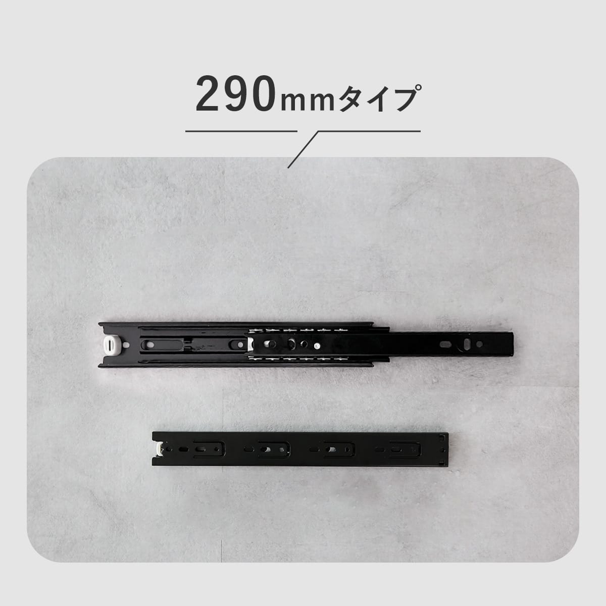 200mm、240mm、290mm、340mmの4サイズから選べるため、様々な家具や引き出しに対応。 リビングの収納家具からキッチンキャビネット、オフィスデスクまで、あらゆる用途に合わせて最適なサイズが選べます。家具に合うレールを見つけて、今より快適にな環境を実現できます。