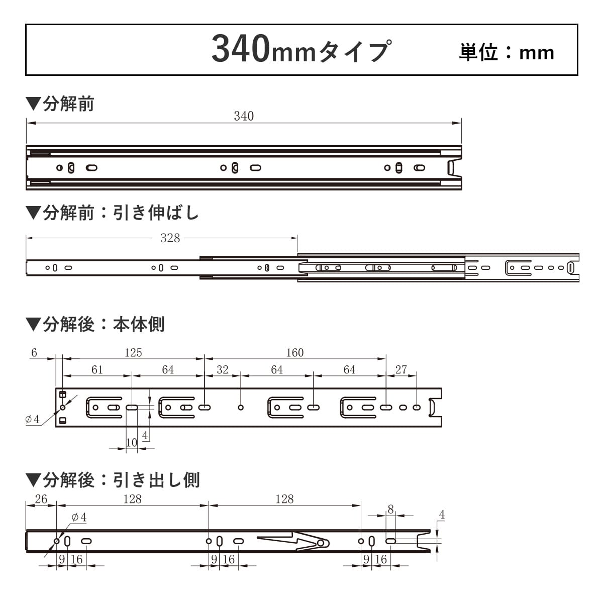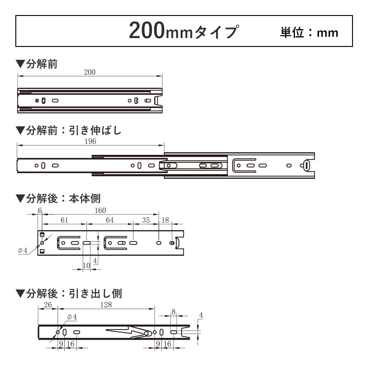 スライドレール 3段引き(4本2ペア)ブラック