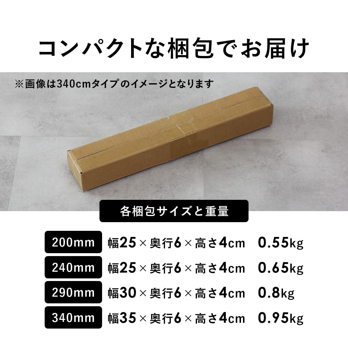 | 総重量(梱包材含む) | 【200mm】0.45kg【240mm】0.49kg 【290mm】0.55kg【340mm】0.56kg |