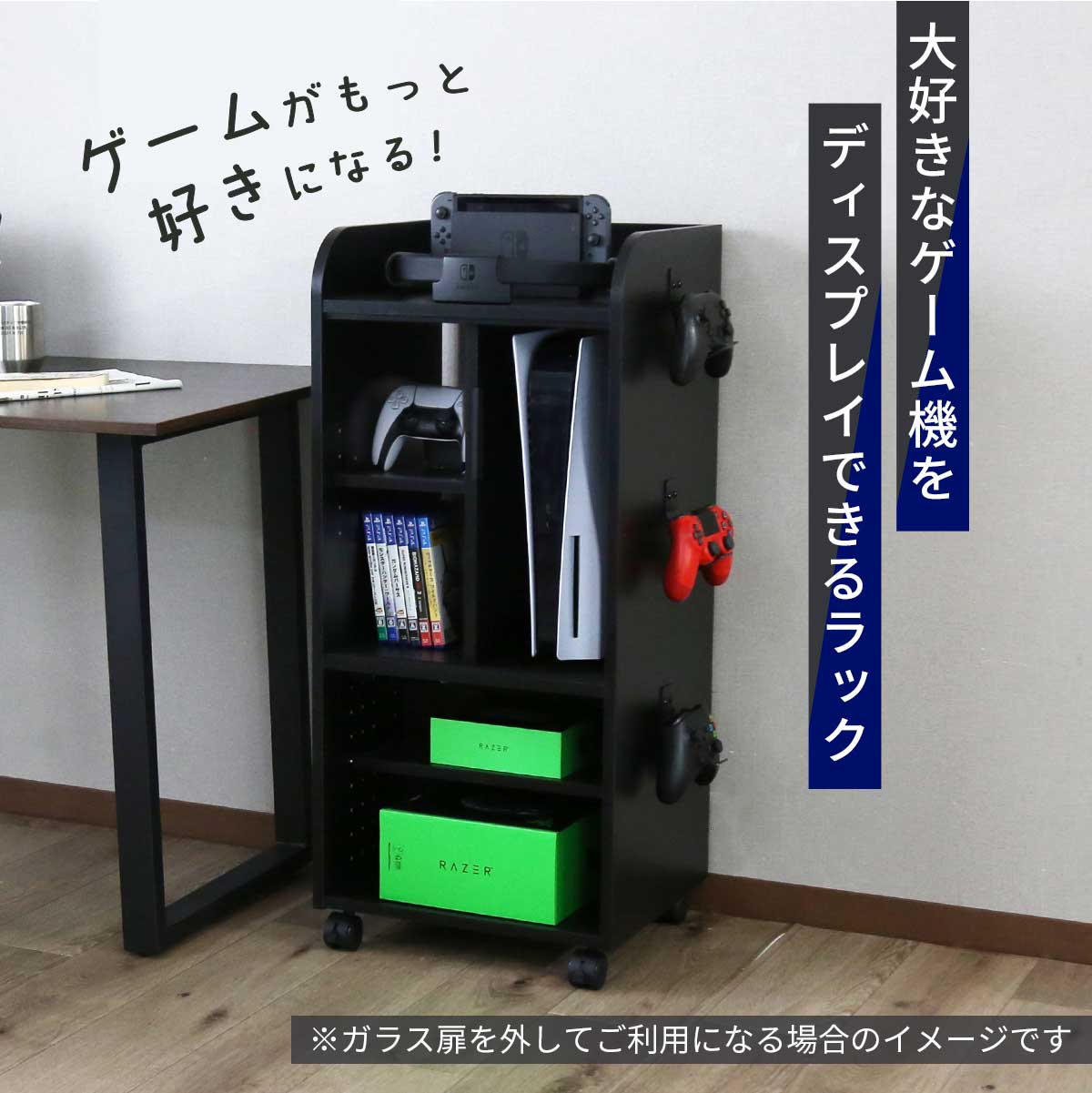コードを広い天板、コントローラーフックや可動棚、ガラス扉など機能満載、オープンタイプで熱がこもらない背面や落下ストッパー、コード穴など細かな仕様でゲーマーなら欲しい一台。テレビ周りをすっきり整えるゲーム機収納ラックです。