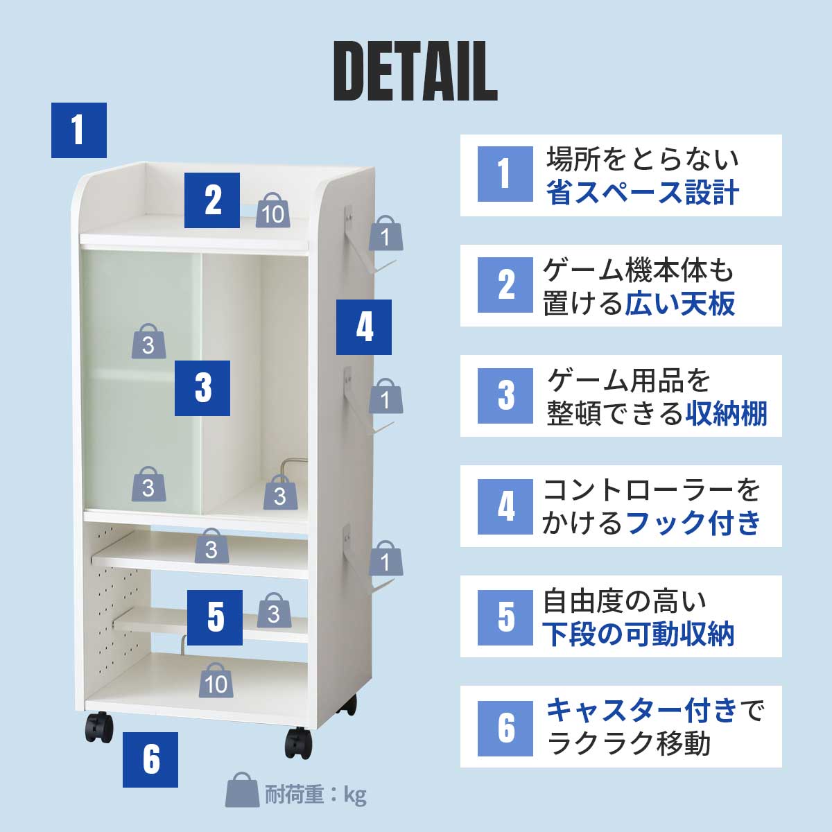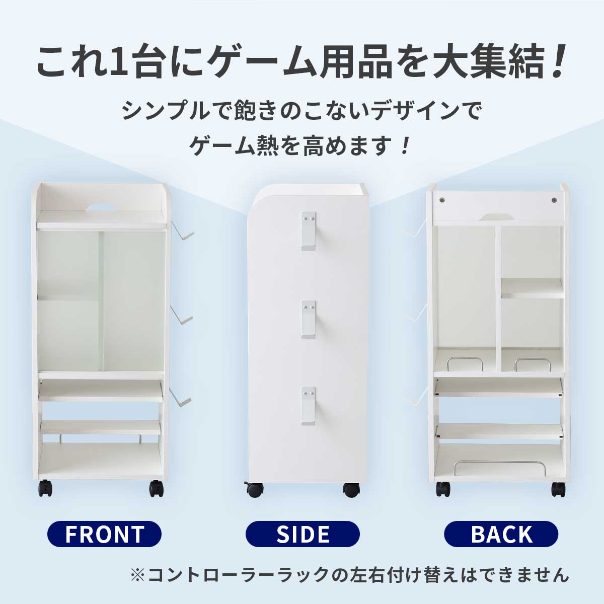 ゲーム用品一式をすっきり収納できる「ゲーム機収納ラック」です。広めの天板、ゲームソフトや周辺機器をまとめてしまえる収納棚、さらにサイドには便利なコントローラーフック付き。リビングや子ども部屋などテレビ周りの収納にぴったりなコンパクトサイズで見た目もスタイリッシュ。ゲームラックとしてはもちろん、リビング収納棚や扉付きキャビネットとしても活躍する、多機能で実用的なゲーム機ラックです。