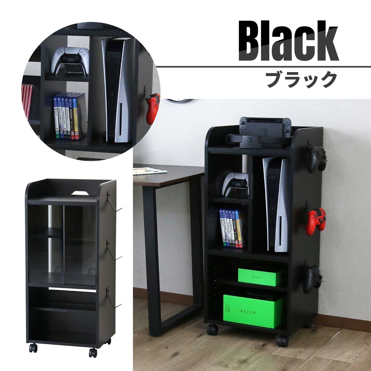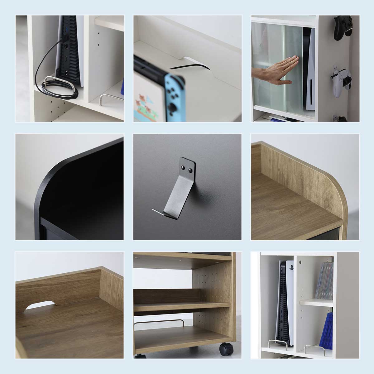 PS5やSwitchなどのゲーム機本体、コントローラー、ソフト、ヘッドセットといったゲーム周辺機器を一か所にまとめられる充実機能の収納ラック。テレビ周りに散らかりがちなアイテムをすっきり整理できすっきりと片付きます。