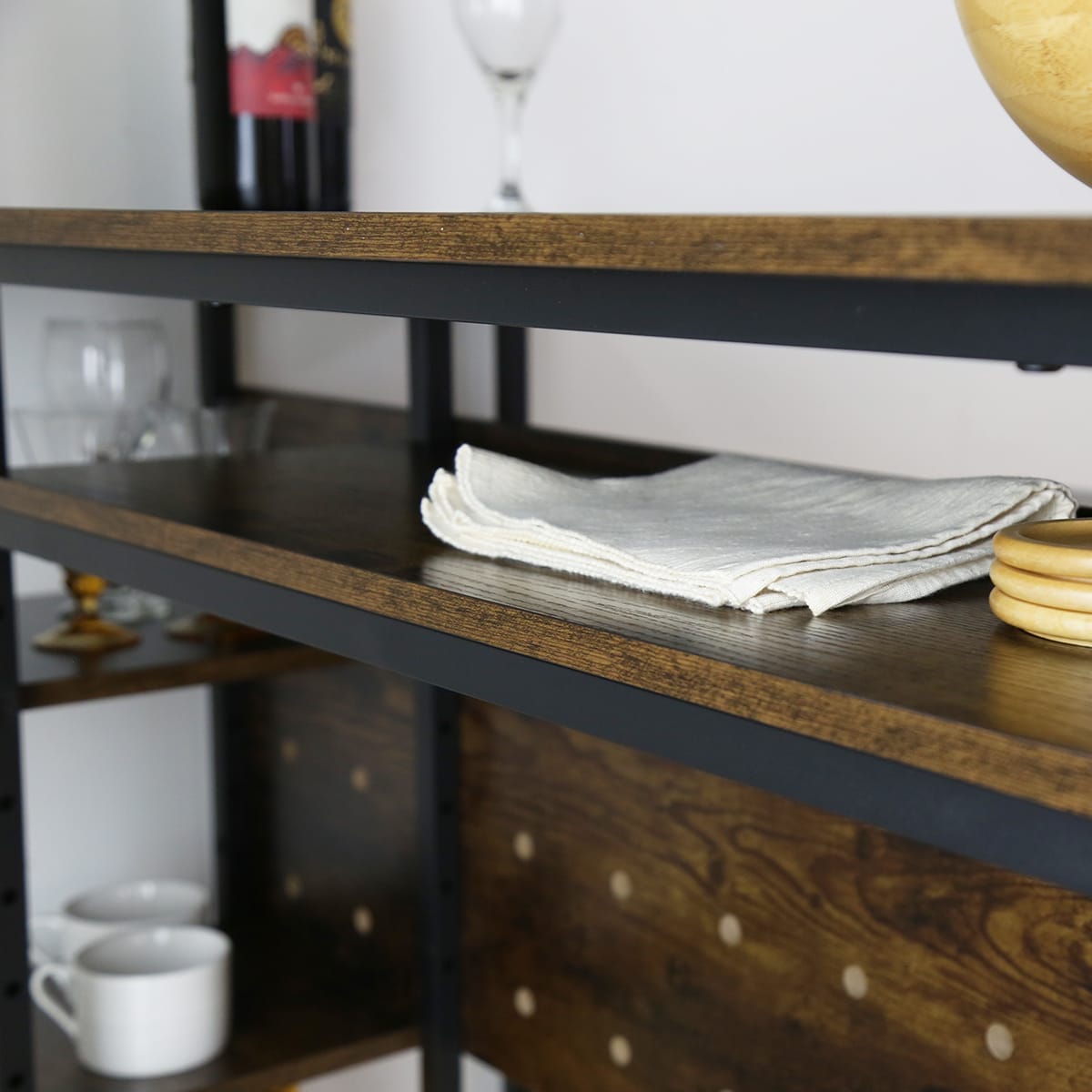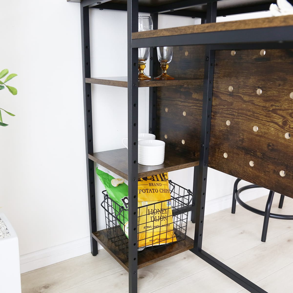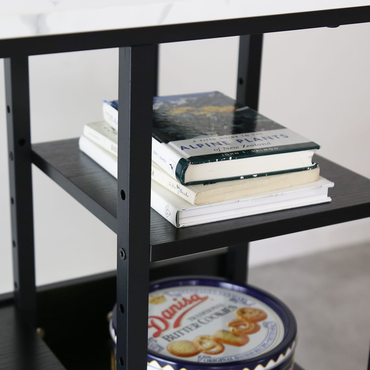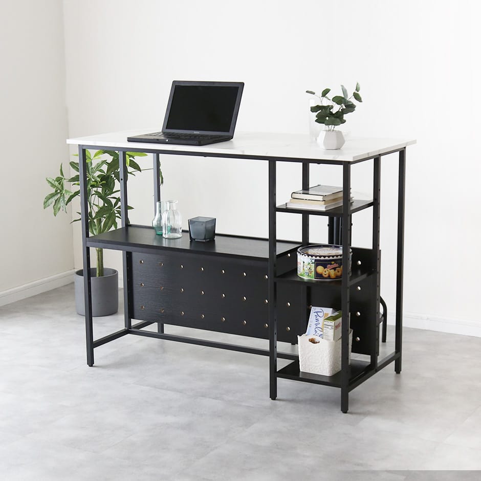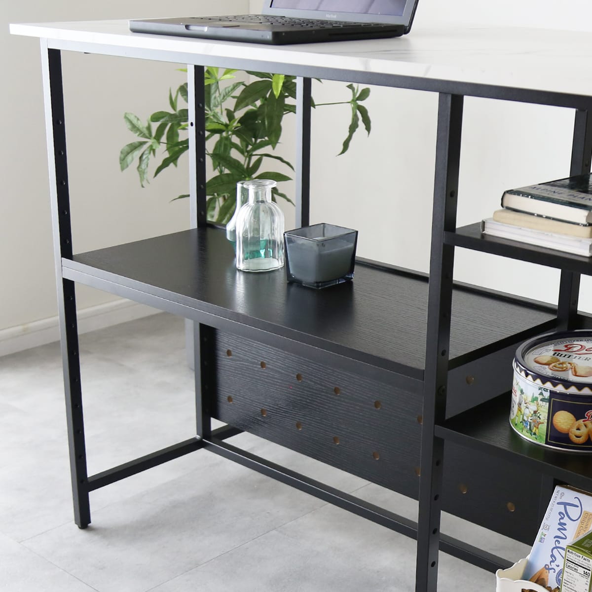 収納力を求める方にとって嬉しいのが、天板下に設けられた4枚の可動式棚板です。高さを自由に調整できるため、生活スタイルや収納するアイテムに合わせて使いやすくアレンジ可能。さらに、この棚部分は左右お好みの方に取り付けられる仕様になっているため、設置場所や間取りに合わせて柔軟にレイアウトできます。例えば、書類やノートパソコンなどの仕事道具をまとめて収納したり、食器や調理器具を整理してキッチンカウンターとして活用したりと、使い道は無限大です。お子様のいるご家庭では、キッズ用のおもちゃや絵本をまとめて置くのにも便利。ナチュラルな木目やモダンな大理石調デザインと組み合わせることで、収納棚でありながらお洒落なインテリアの一部としてお部屋を演出できます。※メッシュバスケットは付属しません