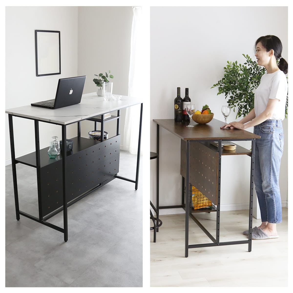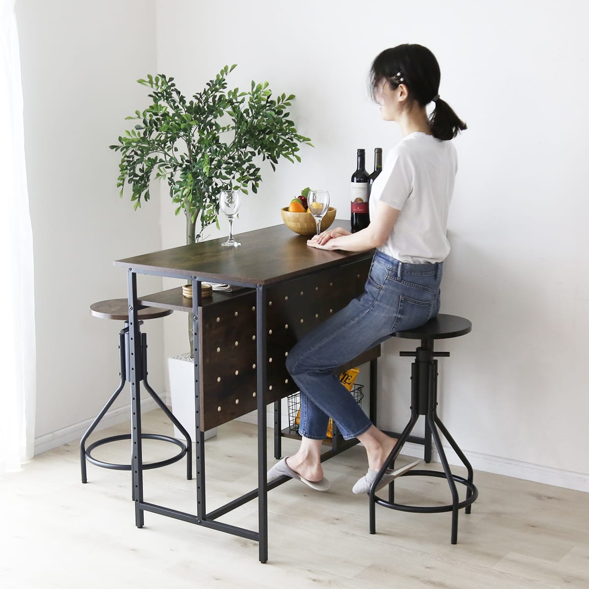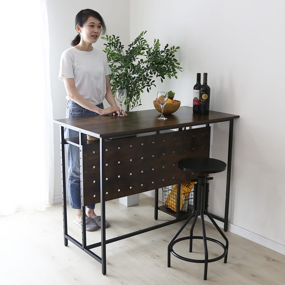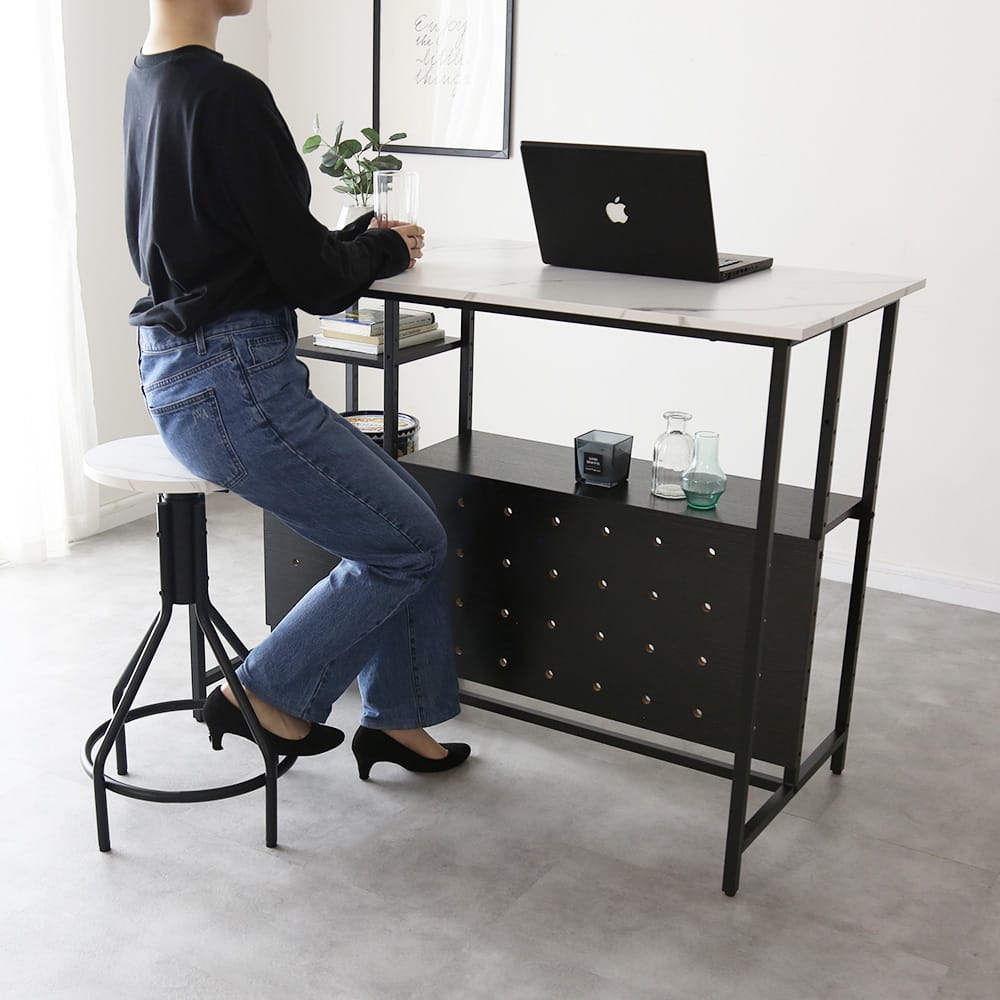仕事や勉強、家事など、日常のさまざまなシーンで活躍するこちらのデスクは、立って作業したいときも、カウンターチェアやスツールに座って作業したいときも使える仕様です。長時間座りっぱなしを避けたい方には立ち作業スタイルが快適で、集中力を高める効果も期待できます。一方で、リラックスして作業や食事を楽しみたい場合は、椅子を合わせて使用することでカフェのような雰囲気を演出。特に一人暮らしのお部屋では、省スペースながらも快適で機能的なインテリアとして重宝します。
