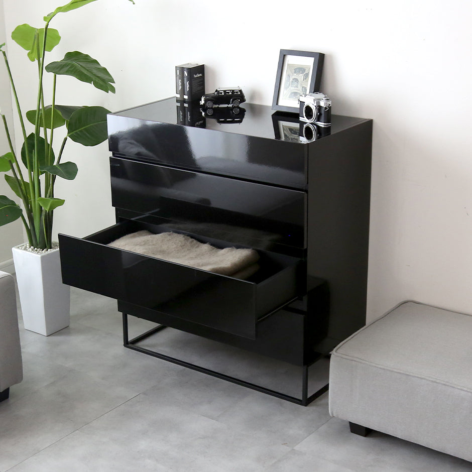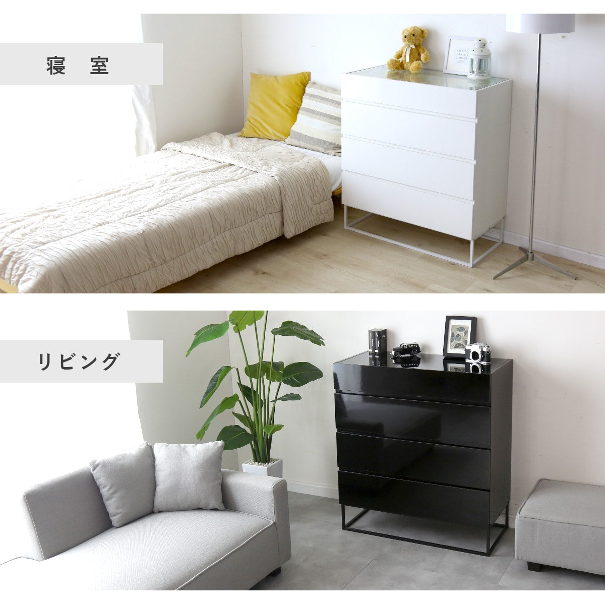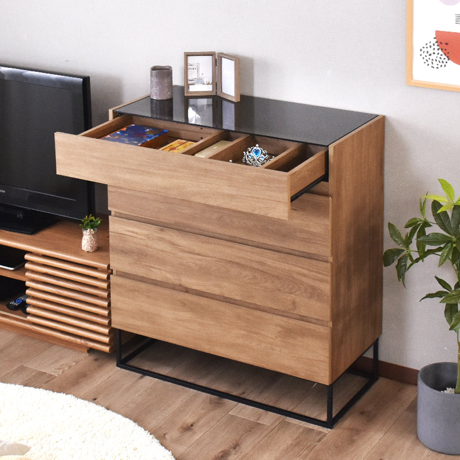 幅80cmの程よいサイズ感とシンプルで無駄のないデザインで寝室やリビングなどさまざまな空間に自然に馴染みます。木目調や石目調、鏡面仕上げから選べのでお部屋のインテリアや雰囲気に合わせてコーディネートが可能。ディスプレイ収納と引き出し収納の機能性を兼ね備えたチェストは、どんな部屋でも快適に使えるデザインです。