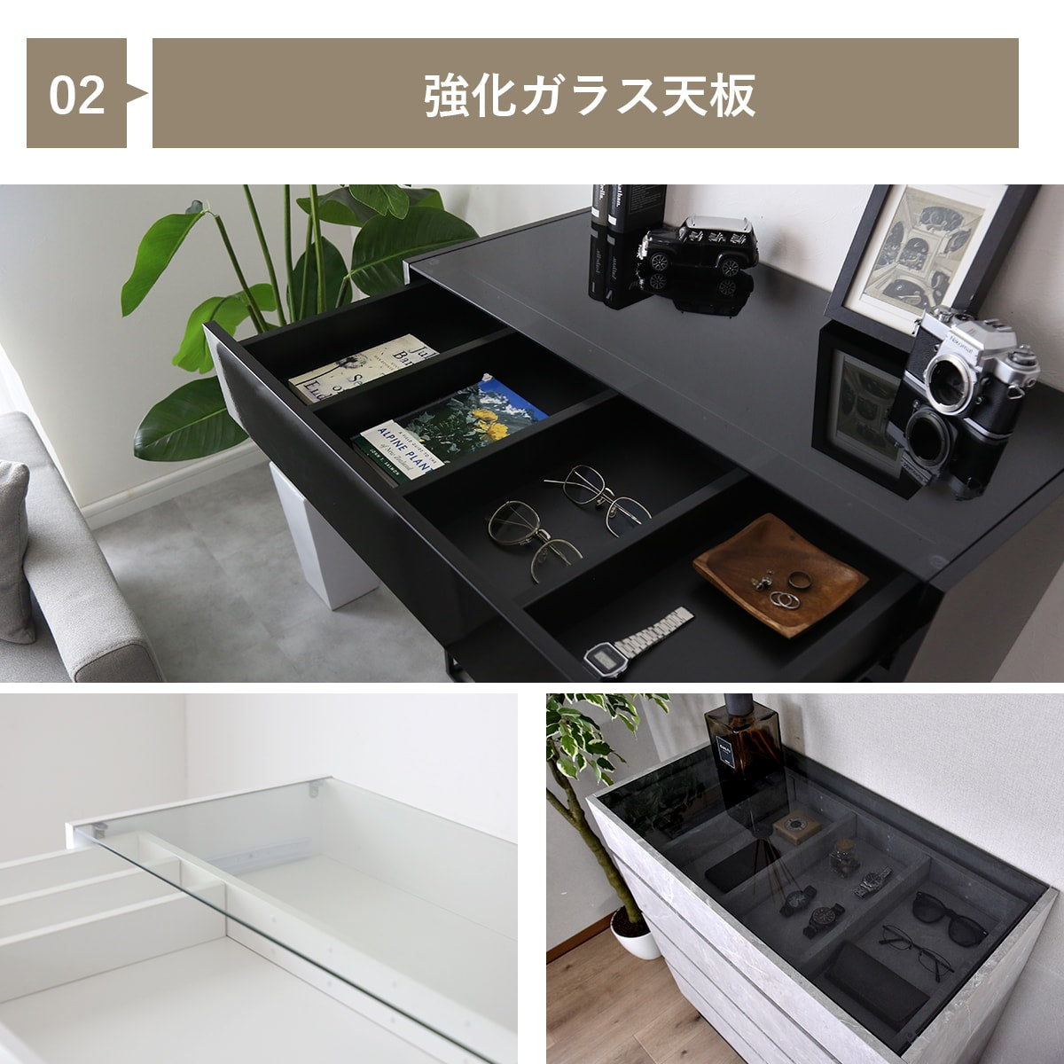 お気に入りのコレクションを飾りながら、実用的に収納できる「ガラスコレクションケース付チェスト」。幅80cmの程よいサイズ感で、寝室やリビングなどあらゆる空間にフィットします。天板部には強化ガラスを採用したスライドトレー式ディスプレイ収納を搭載。引き出すことで大切なアクセサリーや小物をスムーズに出し入れでき、ホコリから守りながら美しく見せることが可能です。さらに3杯の引き出し収納を備え、衣類や日用品をすっきり整理。見せる収納と隠す収納を一台で叶える多機能チェストです。