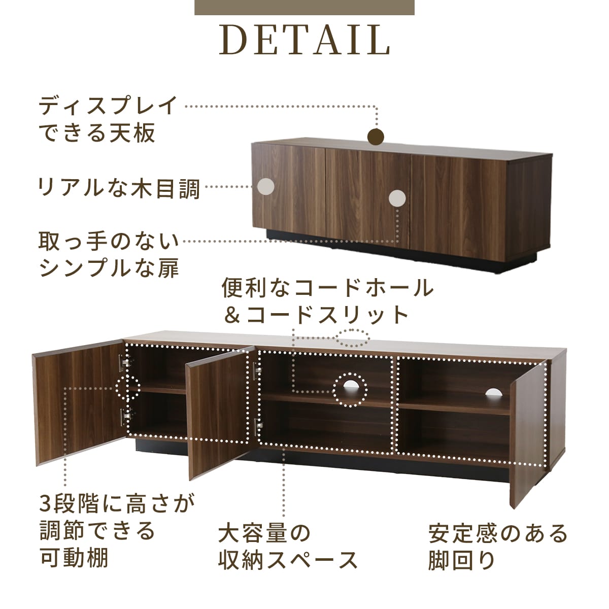 無駄な装飾を省き、フラットな扉と直線的なフォルムを採用することで、見た目のノイズを感じさせないデザインに仕上げています。置くだけで空間が整い、どんなインテリアとも調和しやすい「使いやすさ」と「美しさ」を両立したテレビボードです。