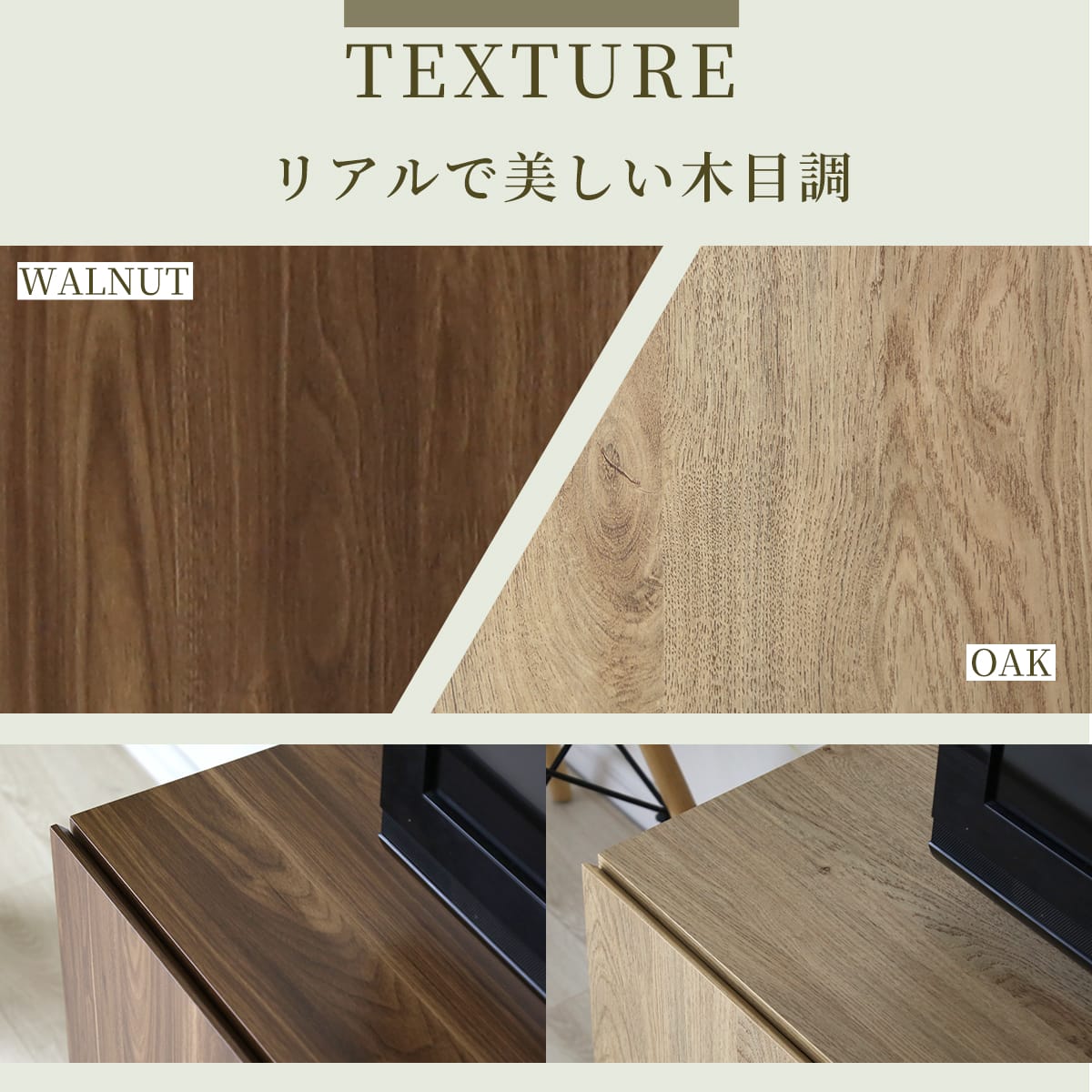 表面にはリアルな木目を再現したシートを使用し、節や濃淡も自然で無垢材のような温もりが楽しめます。フラットな天板は、テレビ台としてはもちろん、植物や家電、雑貨のディスプレイにも便利で、実用的なスペースとしても活躍します。