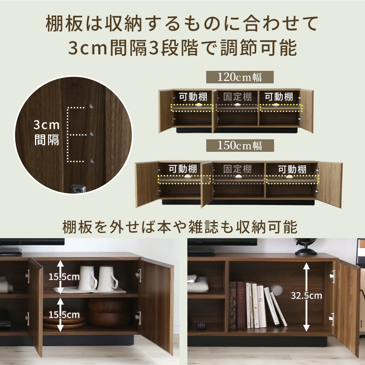 扉付き収納で書類や日用品の散らかりを隠せ、生活感を抑えてリビングをすっきり見せます。さらに左右の収納は3段階の可動棚で高さを自由に調整でき、収納物に合わせて効率よく整理可能です。
