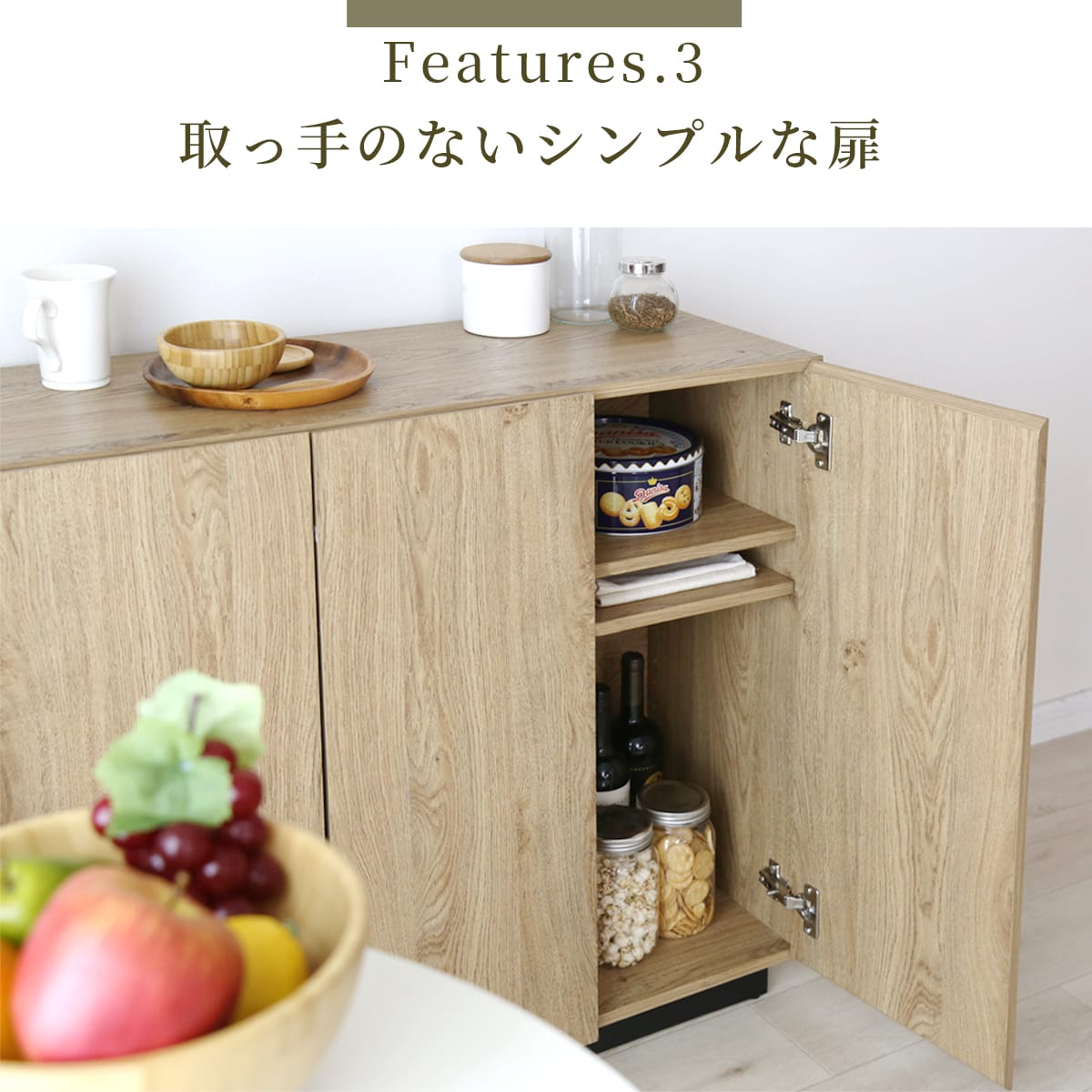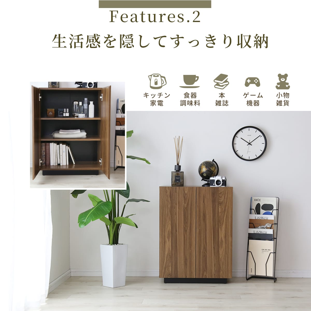 無駄な装飾を省き、フラットな扉と直線的なフォルムを採用することで、見た目のノイズを感じさせないデザインに仕上げています。置くだけで空間が整い、どんなインテリアとも調和しやすい「使いやすさ」と「美しさ」を両立したキャビネットです。