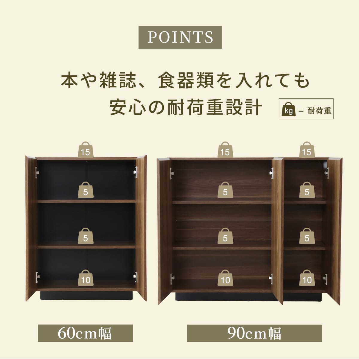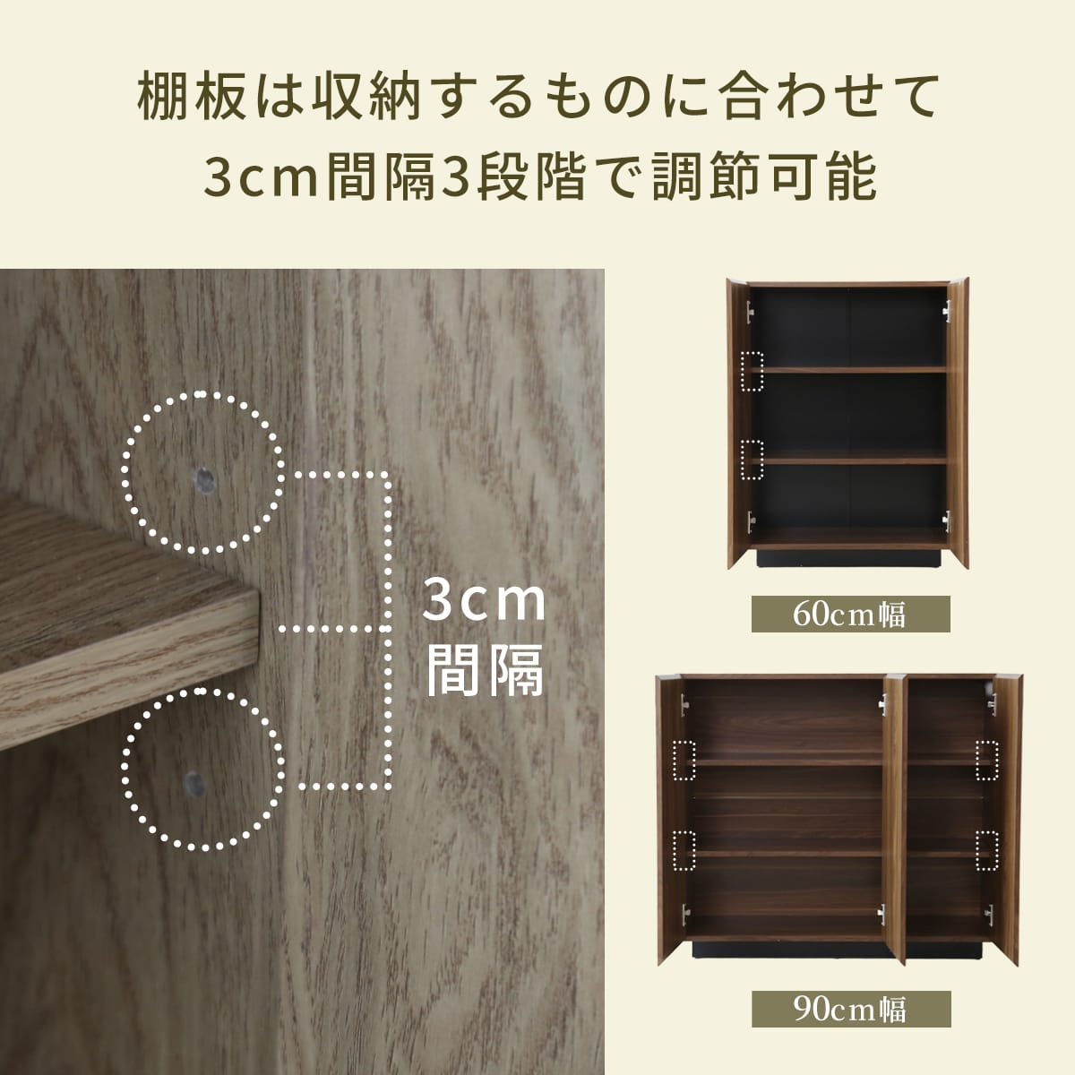 幅60cm・幅90cmの2サイズで動線を邪魔しないコンパクト設計。省スペースでも置きやすく、リビングやキッチンの食器収納、玄関や寝室の雑貨入れなど、場所を選ばず幅広く活躍します。