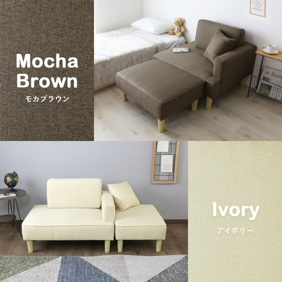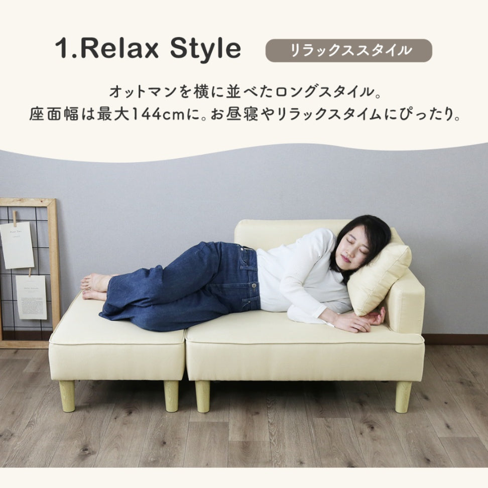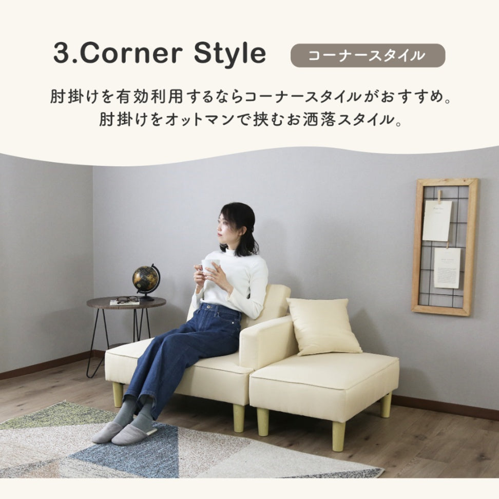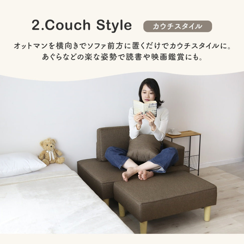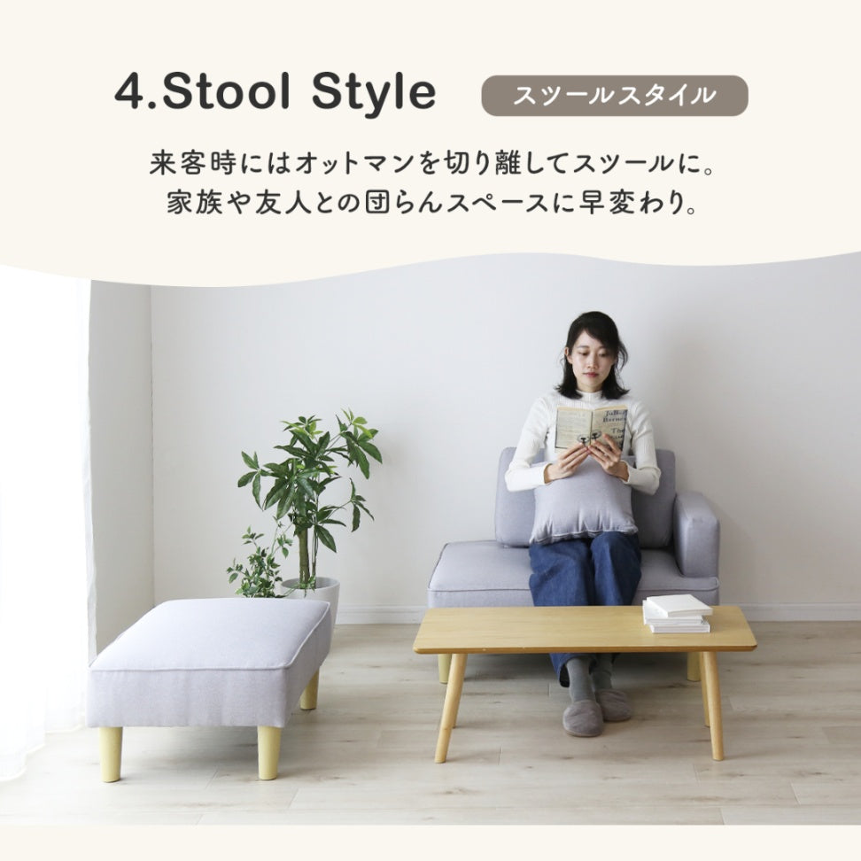 オットマンを自由に組み合わせて使えるのがポイント。L字のカウチソファとしてくつろいだり、オットマンを独立させて来客用のスツールとして使ったりと、シーンに合わせた使い方が可能です。模様替えやお掃除の際にも簡単に動かせるので、気軽にお部屋の印象を変えられます。限られたスペースでも“配置を変えるだけで雰囲気が変わる”のがこのソファの魅力です!