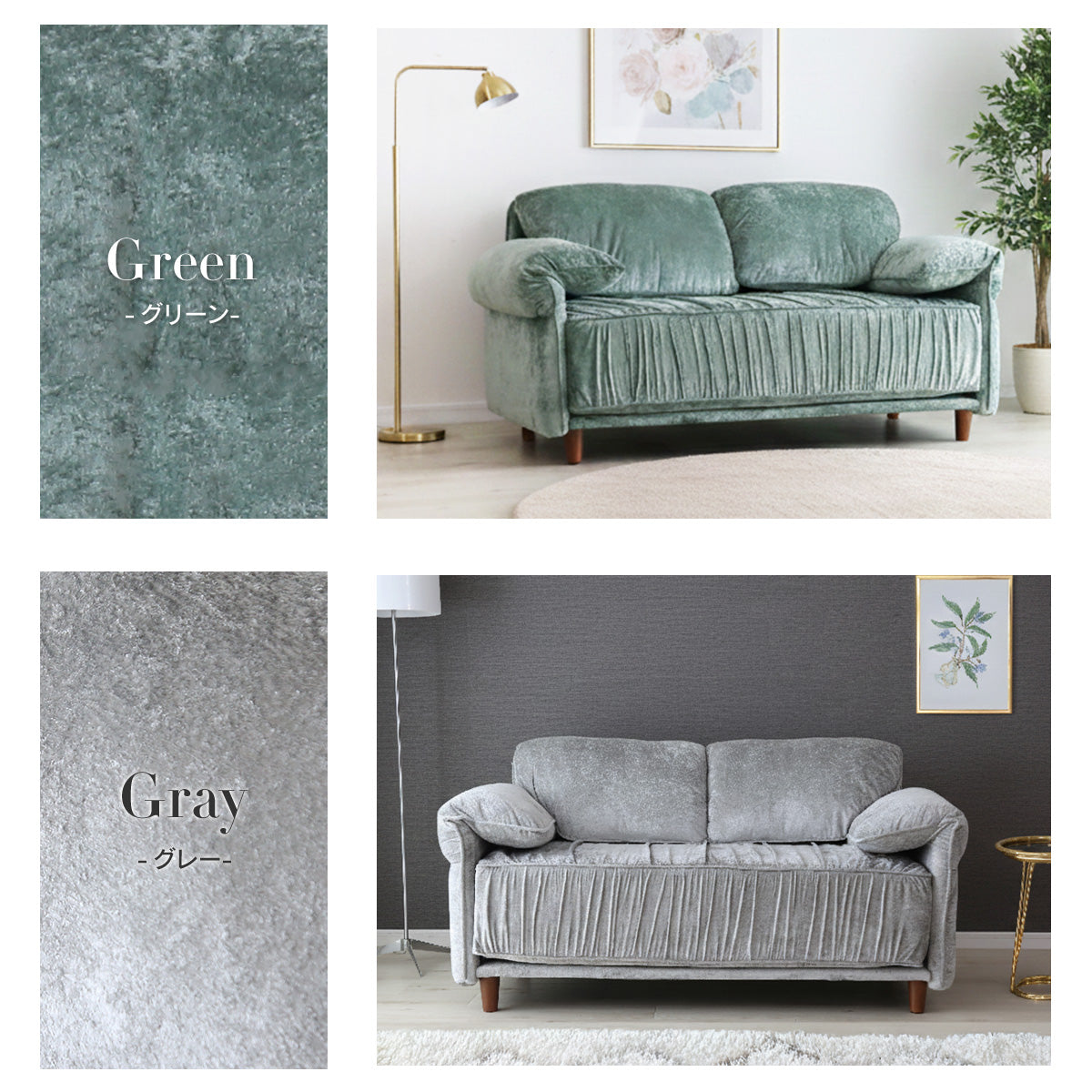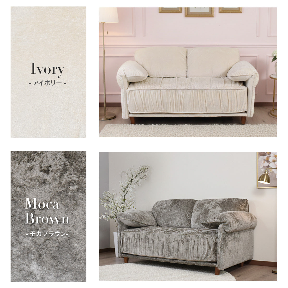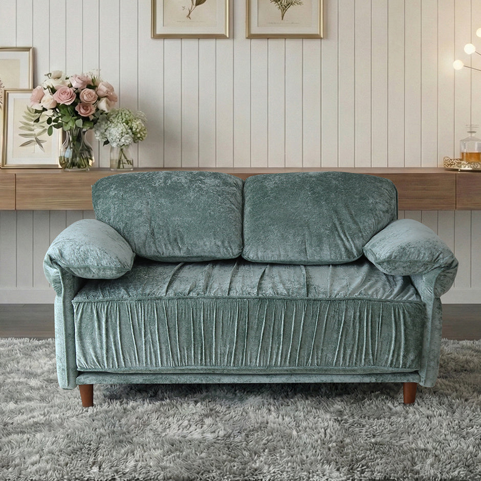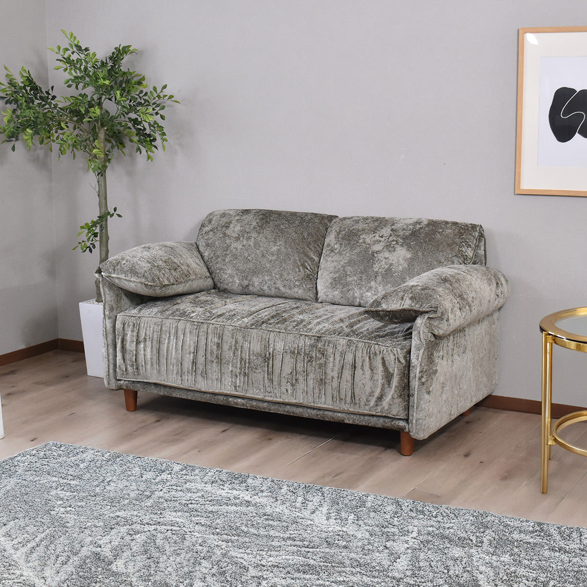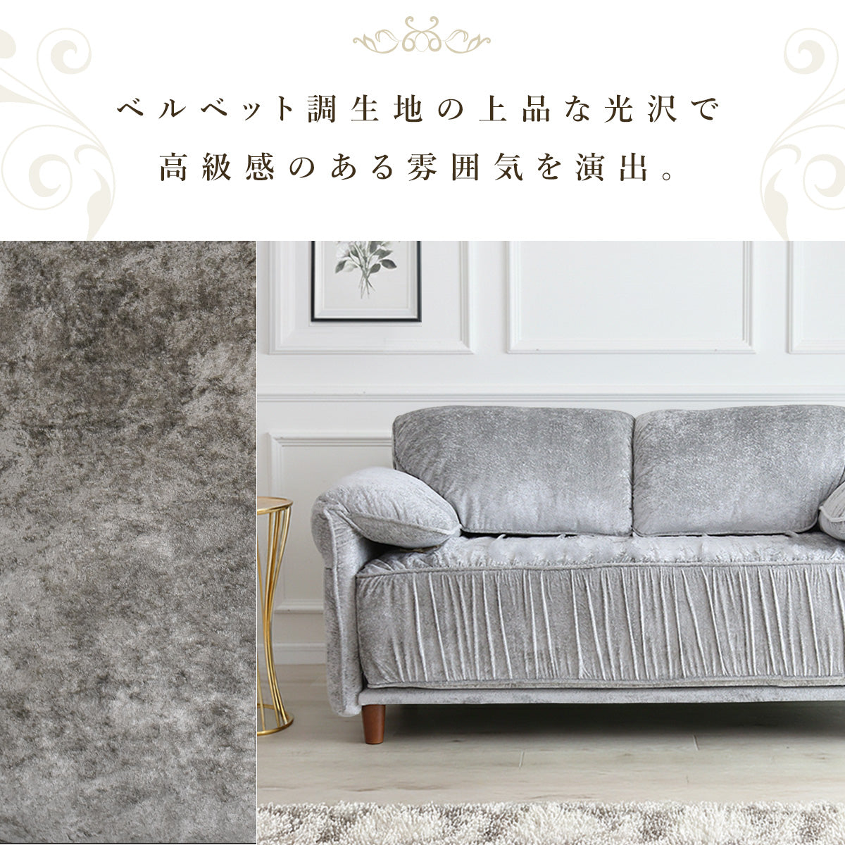 張地には、上品な光沢感が特徴のベルベット調生地を使用しております。光の当たり方によって表情が変わり、シンプルなお部屋でも一気にエレガントで高級感のある雰囲気を演出いたします。なめらかな触り心地のため、座った瞬間に心地よさを実感していただけ、思わず長くくつろぎたくなる仕上がりです。ソファとしての存在感はありつつ、主張しすぎないデザインのため、リビングはもちろん私室や寝室にも合わせやすくなっております。おしゃれさと落ち着きを両立した、ワンランク上の2Pソファをお探しの方におすすめです。