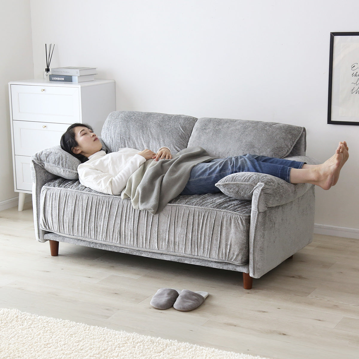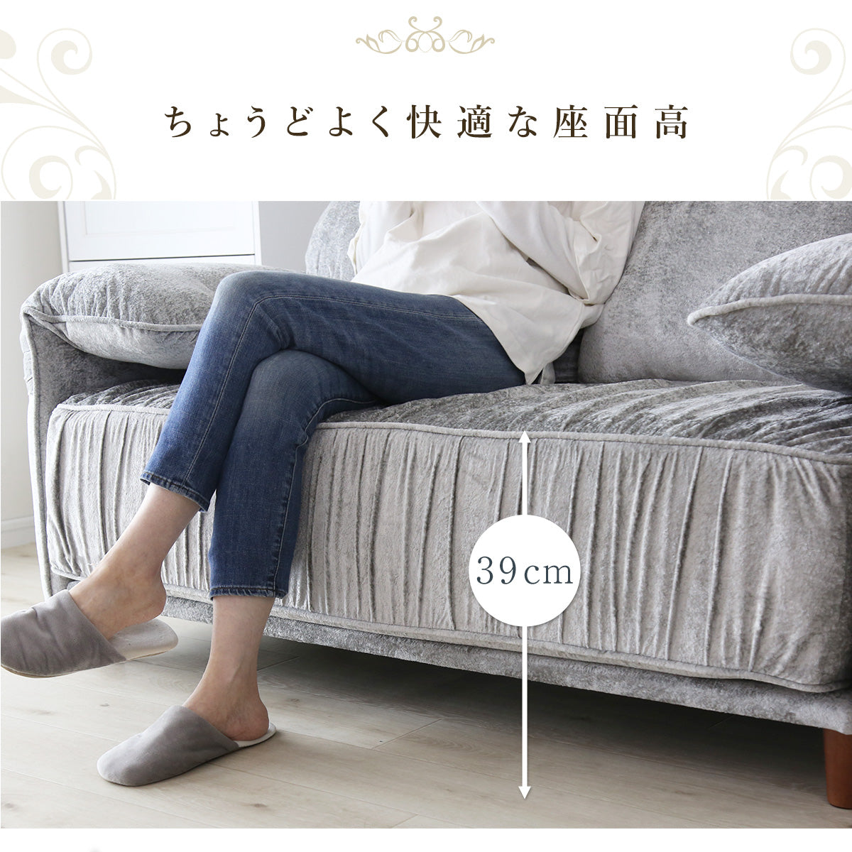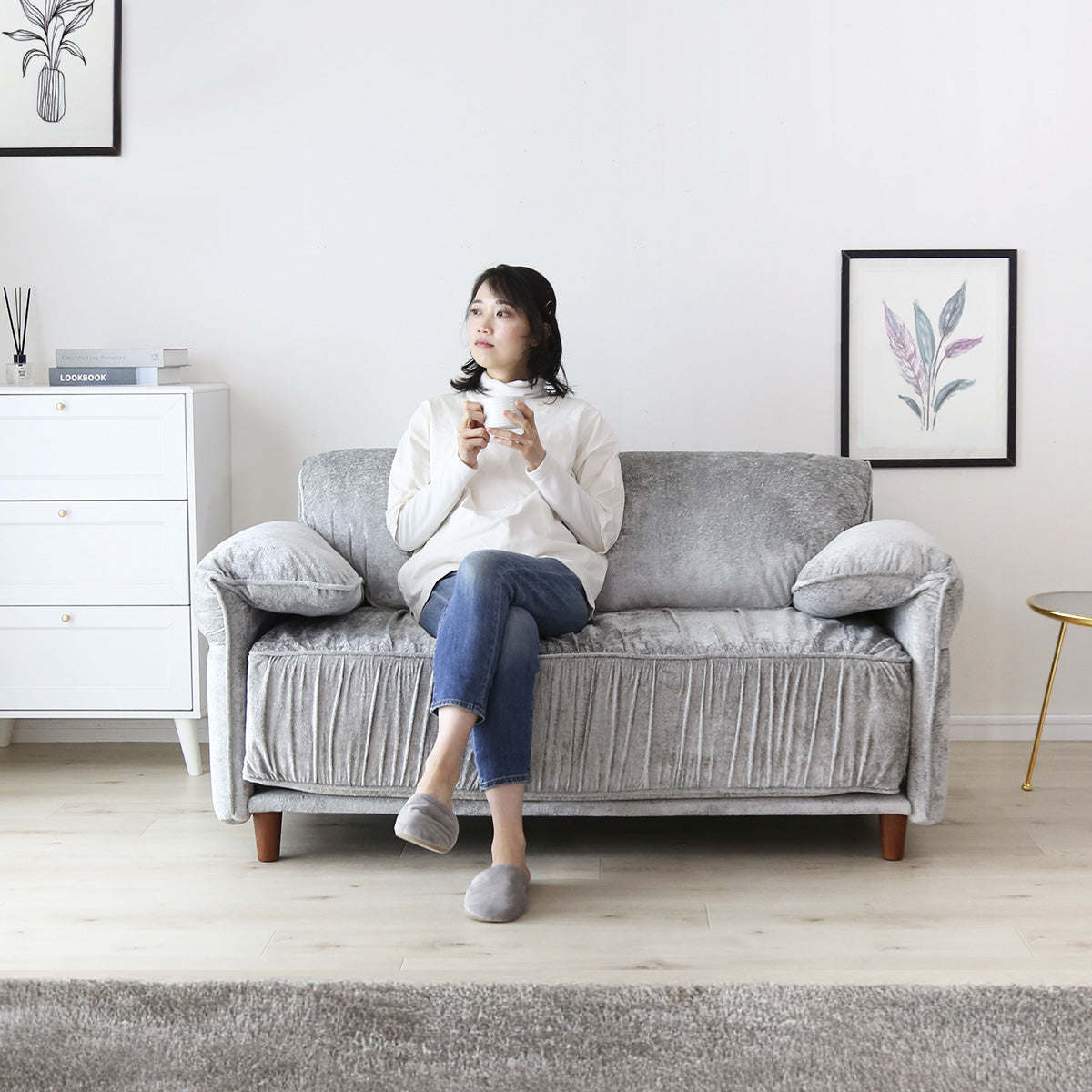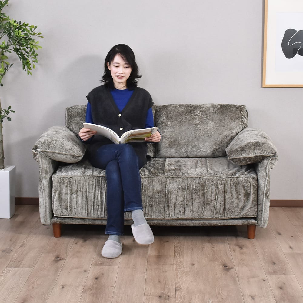 座面高は、低すぎず高すぎない絶妙な設計となっております。深く沈み込みすぎないため、立ち上がる際もスムーズで、毎日の動作が快適になります。ソファとしてくつろぐのはもちろん、椅子やチェア感覚でもお使いいただけるのが魅力です。食後に少し腰掛けたり、読書やスマートフォン操作の時間を楽しんだりと、さまざまなシーンで活躍いたします。リビングだけでなく、私室や寝室に設置しても使いやすい高さのため、生活スタイルに合わせて自由にお使いいただける2Pソファです。
