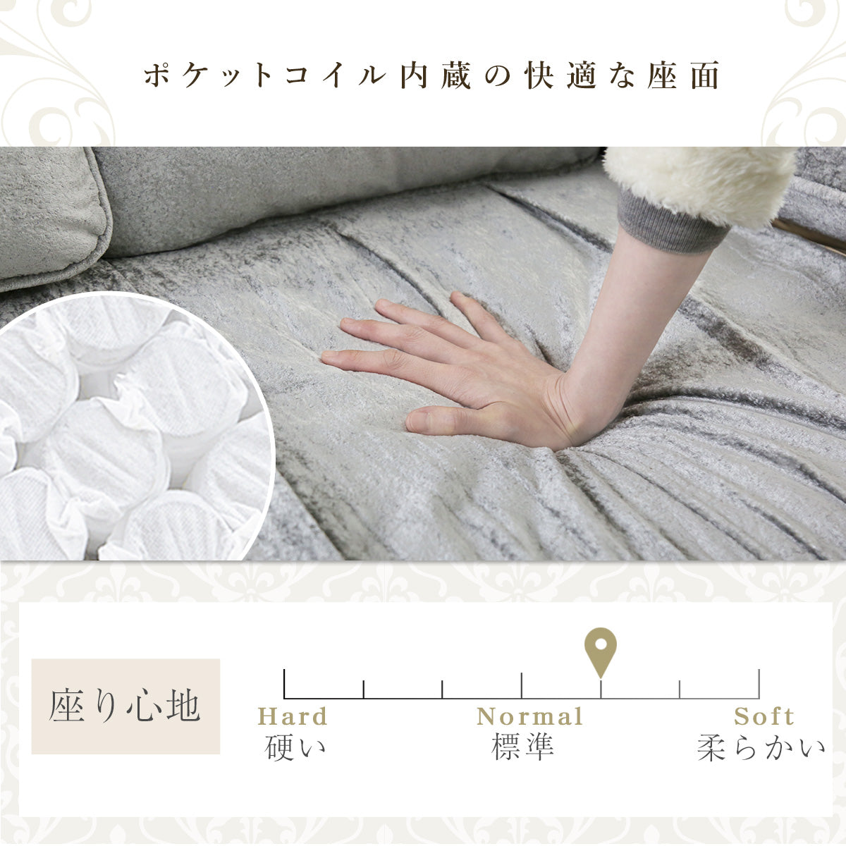 座面にはポケットコイルを使用しており、しっかりとした安定感と快適な座り心地を両立しております。コイルが一つひとつ独立して配置されているため、身体のラインや動きに合わせて細かくフィットし、体圧を分散して支える構造です。そのため、長時間お座りいただいても特定の部分に負担がかかりにくく、快適な状態を保ちやすくなっております。適度な弾力があるため、沈み込みすぎず立ち座りもスムーズ。日常使いはもちろん、くつろぎの時間をより上質に演出する座面設計です。