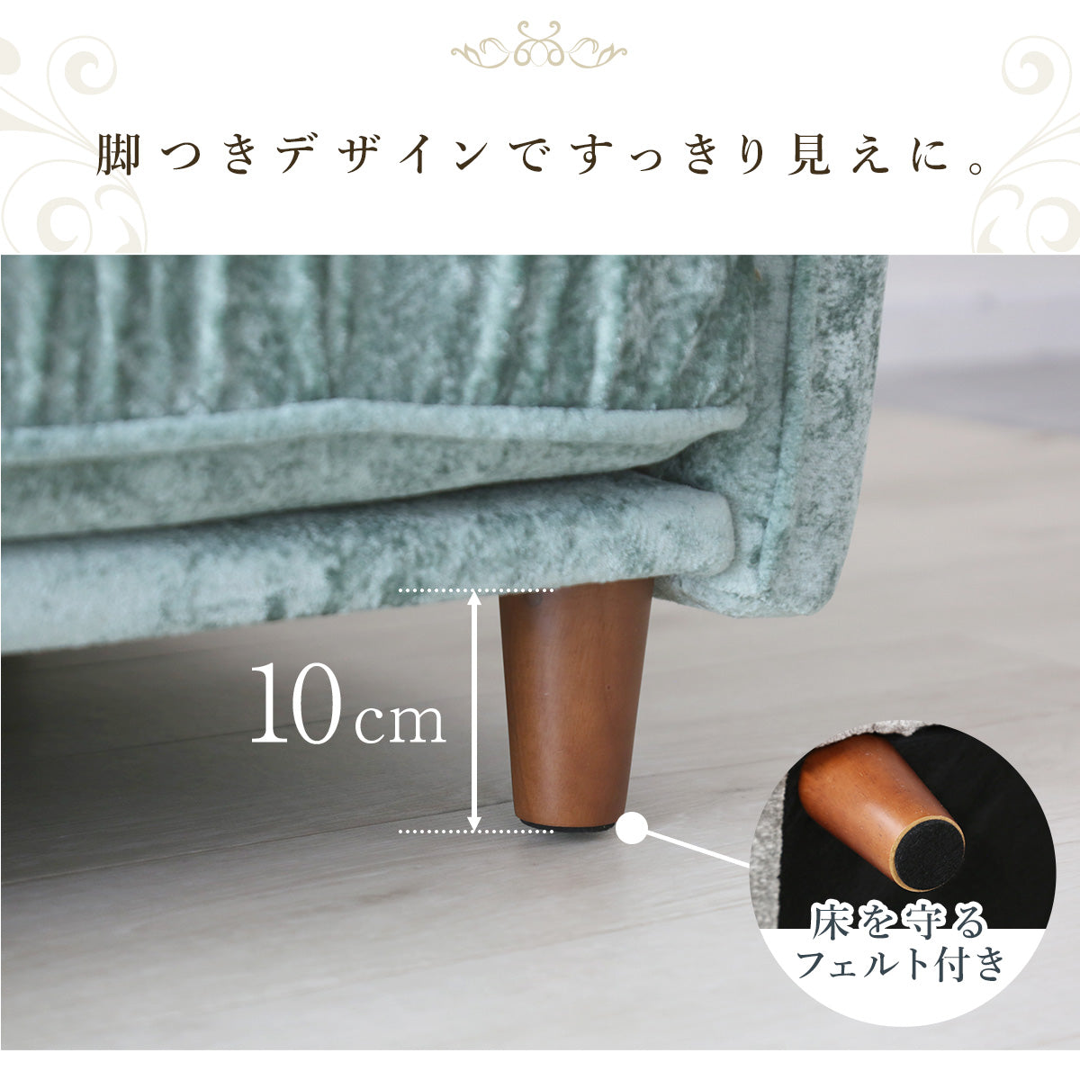 脚付きデザインを採用することで、重たく見えがちな二人掛けソファでも軽やかな印象になります。床が見える分、空間に抜け感が生まれ、お部屋を広く見せてくれる効果がございます。一人暮らしや二人暮らしのコンパクトなリビングでも、圧迫感を感じにくい点がポイントです。さらに、ソファ下に空間があるため、掃除機やロボット掃除機も通しやすく、お手入れも簡単です。デザイン性だけでなく、日常使いのしやすさまでしっかり考えた脚付きソファです。