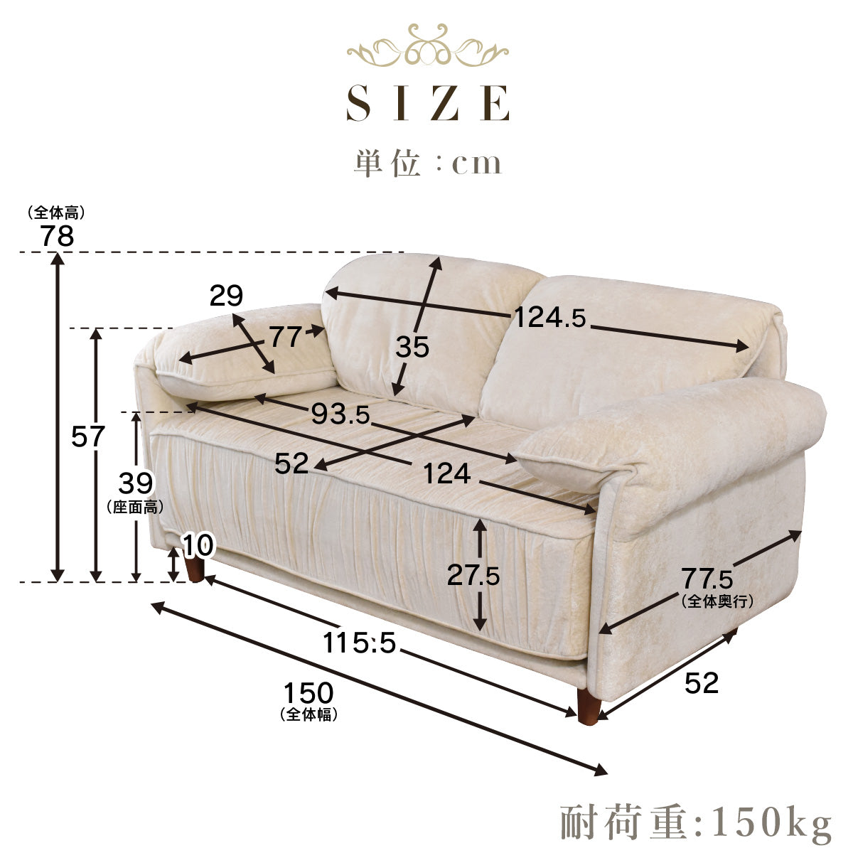 | サイズ | 幅150×奥行77.5×高さ78 (cm) 座面高:39cm ※個体差により若干の差異あり |